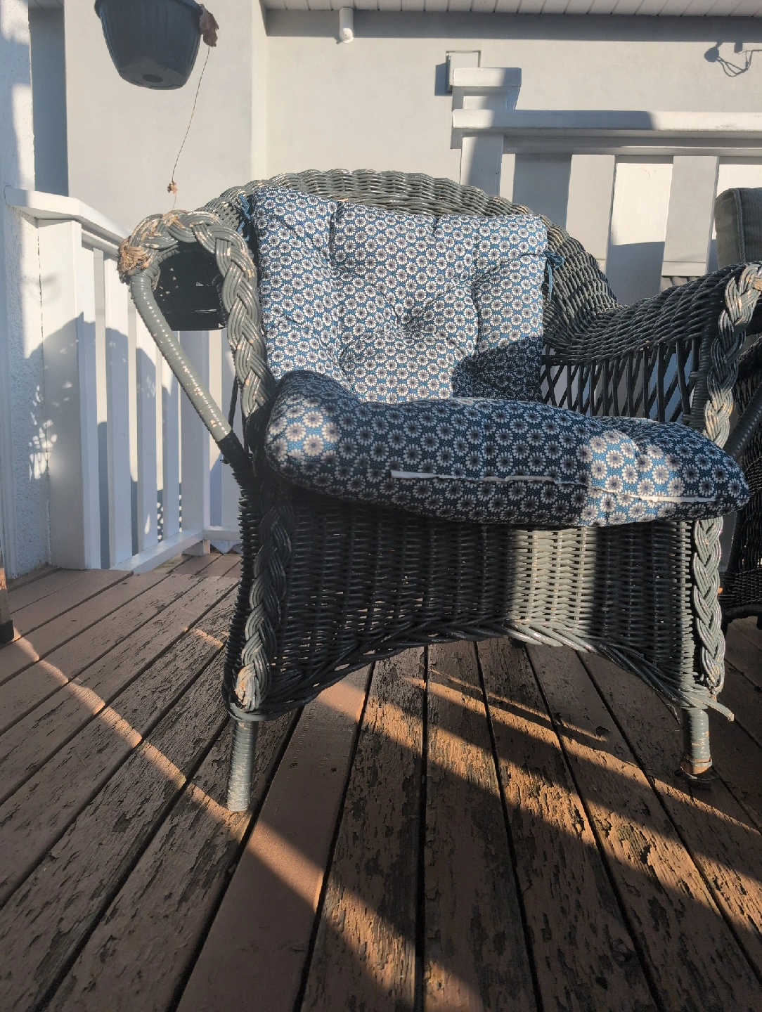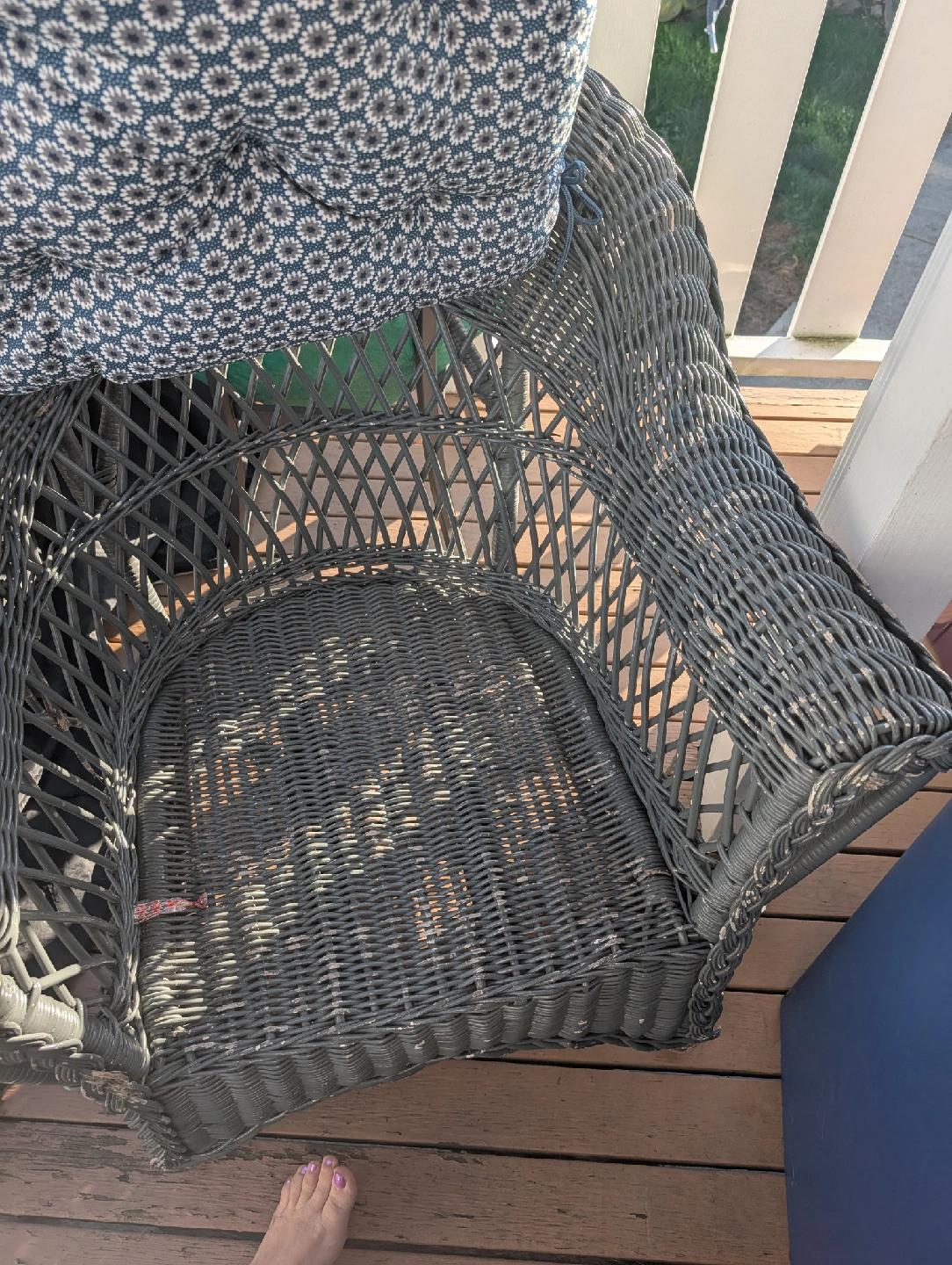 Selling a comfy wicker patio chair! It comes with a one piece seat back cushion. The chair is in good condition and ready to add some charm to your outdoor space. Could use a new paint job but perfectly fine as is.