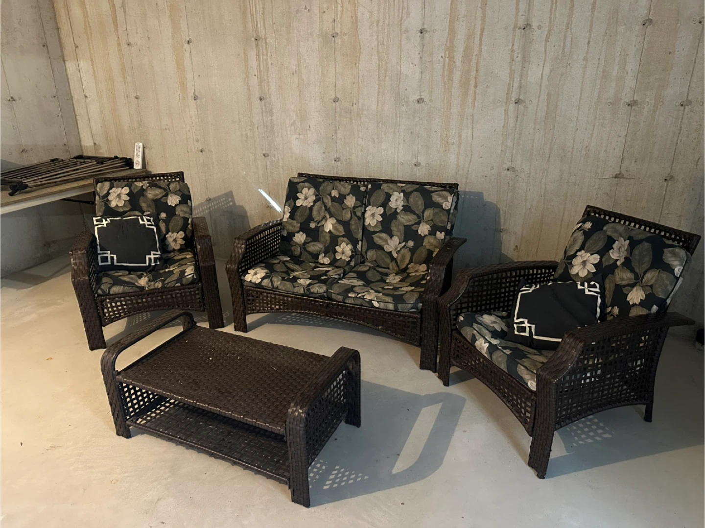 Selling a wicker patio set! It includes a loveseat, two chairs, and a coffee table. The cushions have a floral pattern. Perfect for enjoying the outdoors on your deck or patio
