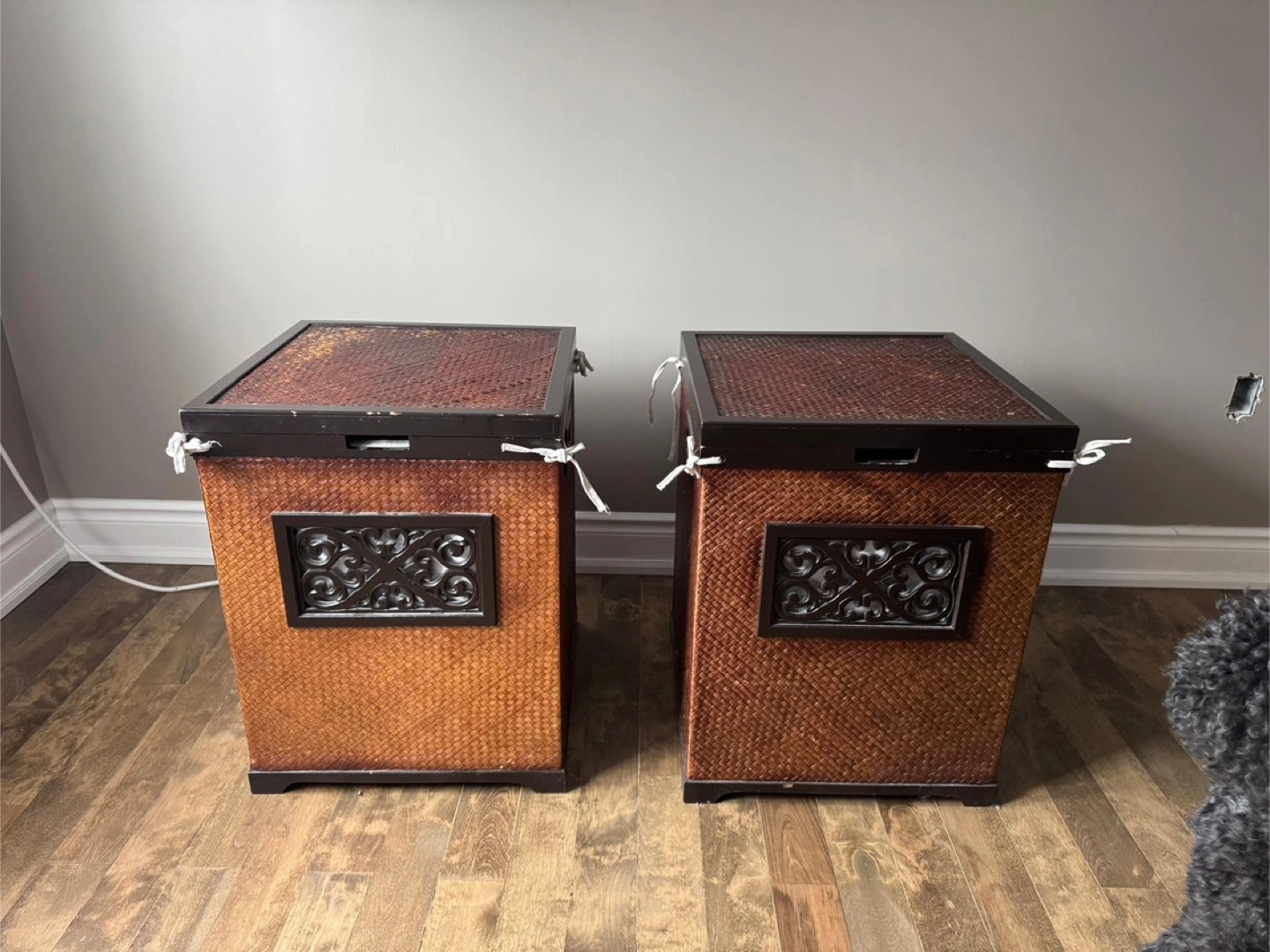 Selling two wicker storage boxes that can also be used as side tables. They have a unique design and are in good condition. Perfect for adding a touch of natural texture to your home!