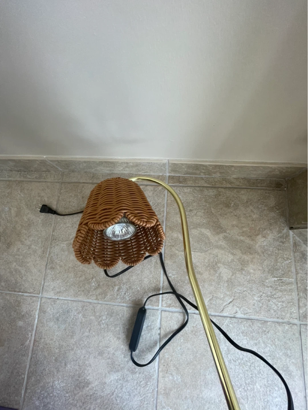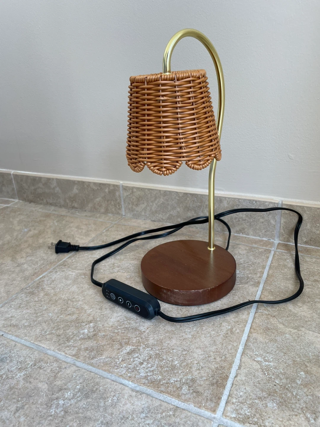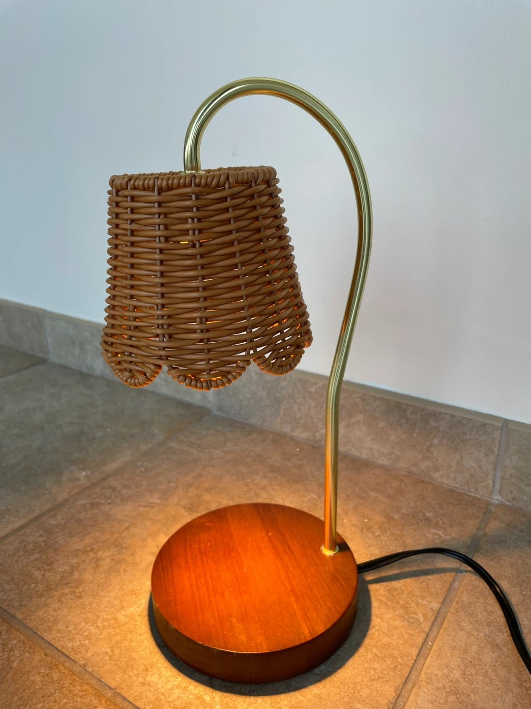 This charming wicker table lamp has a lovely brass finish. It would be a great addition to any room. It's in great condition and ready to light up your space!