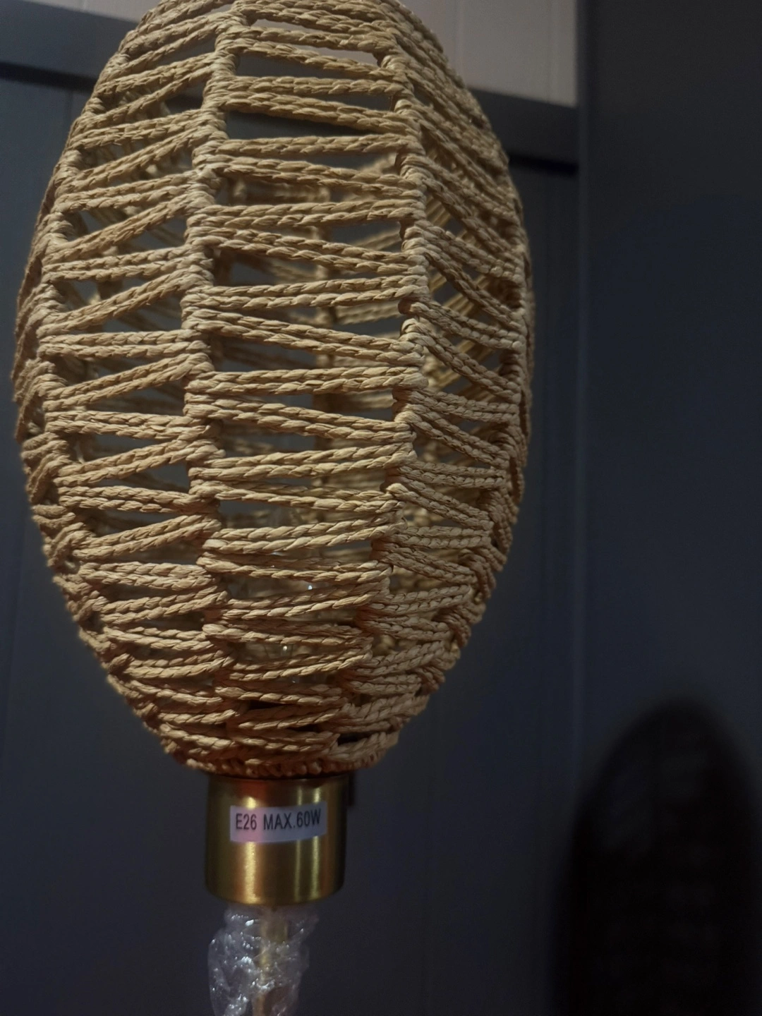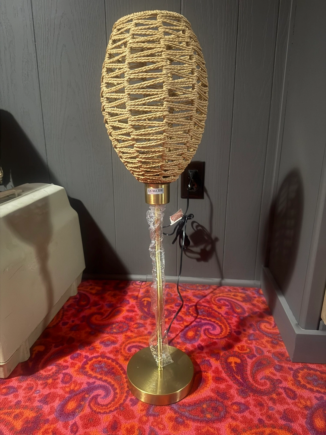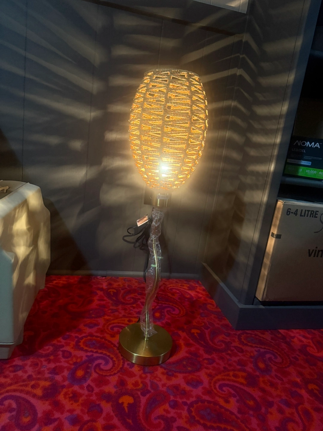 This is a lovely wicker table lamp, perfect for adding a warm and cozy touch to any room! It features a unique wicker shade and a stylish gold base. ready to brighten up your space Pick up regent freshco