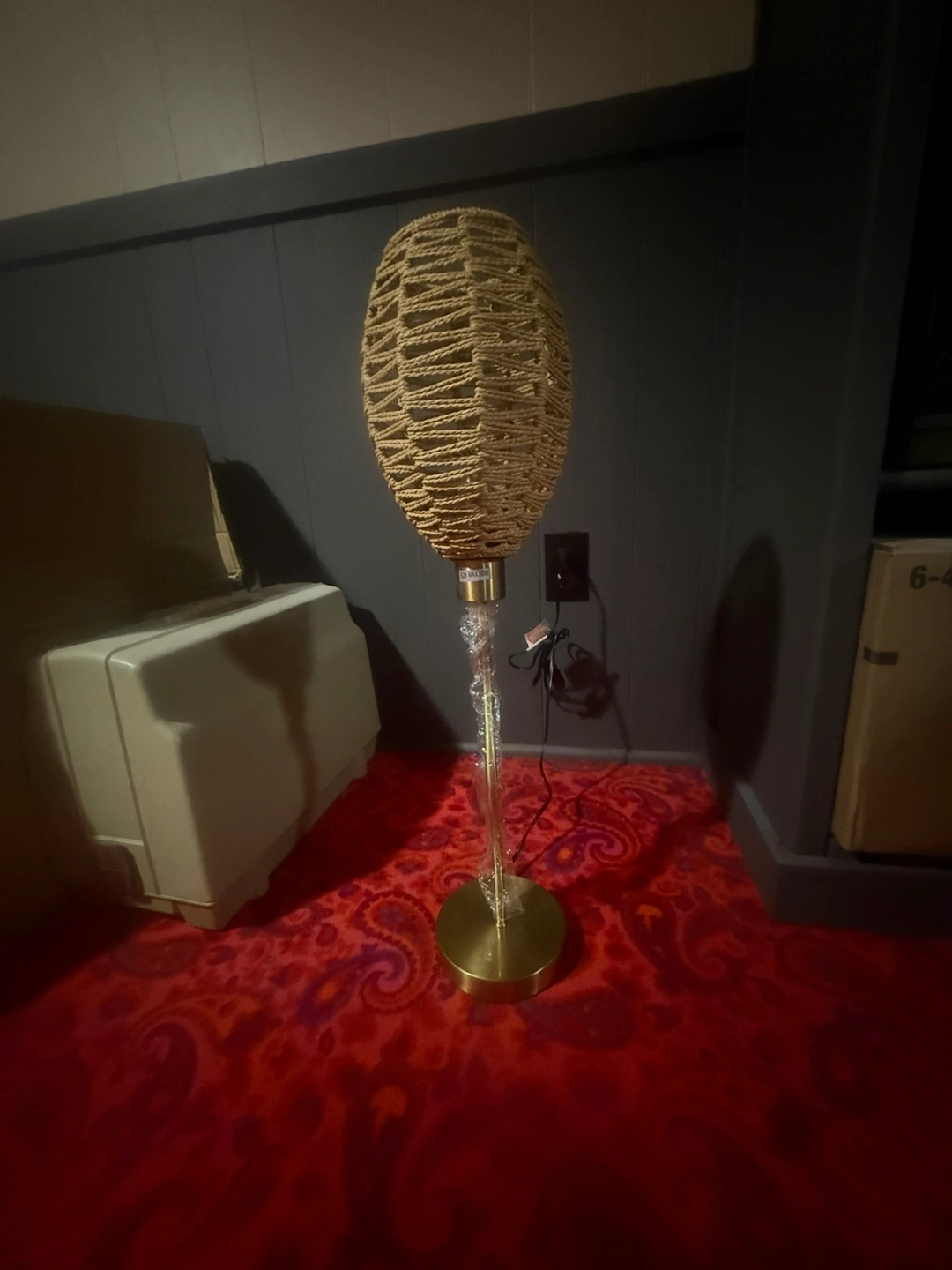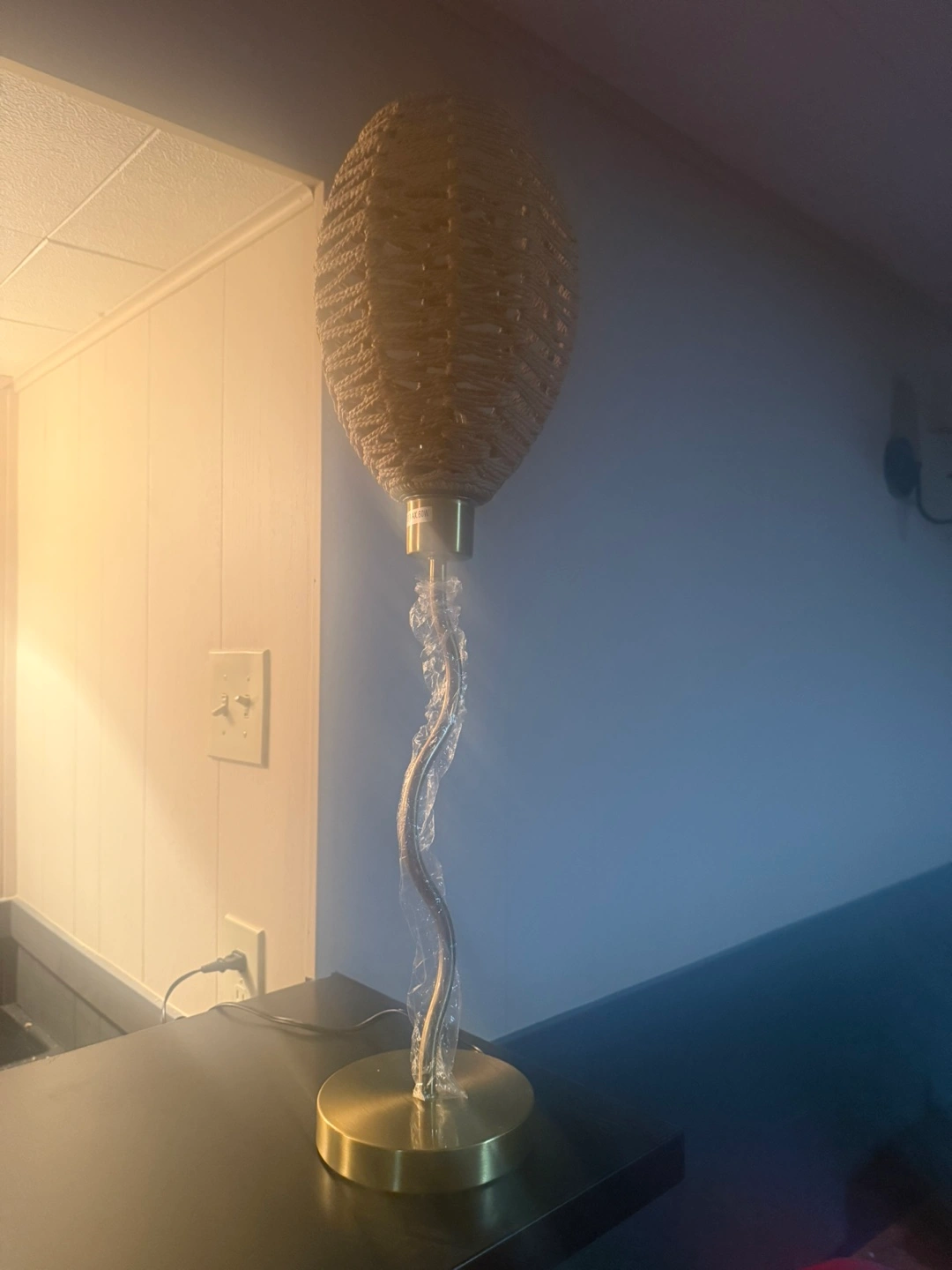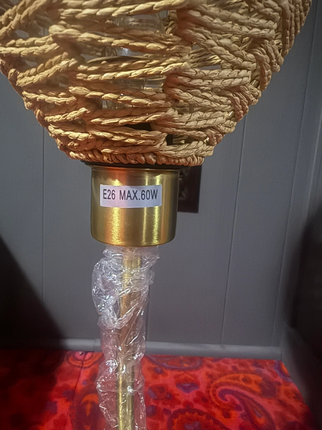 This is a lovely wicker table lamp, perfect for adding a warm and cozy touch to any room! It features a unique wicker shade and a stylish gold base. ready to brighten up your space Pick up regent freshco