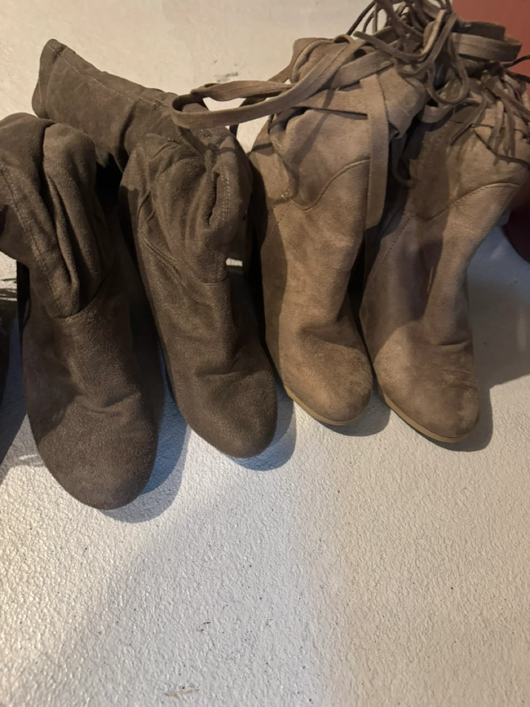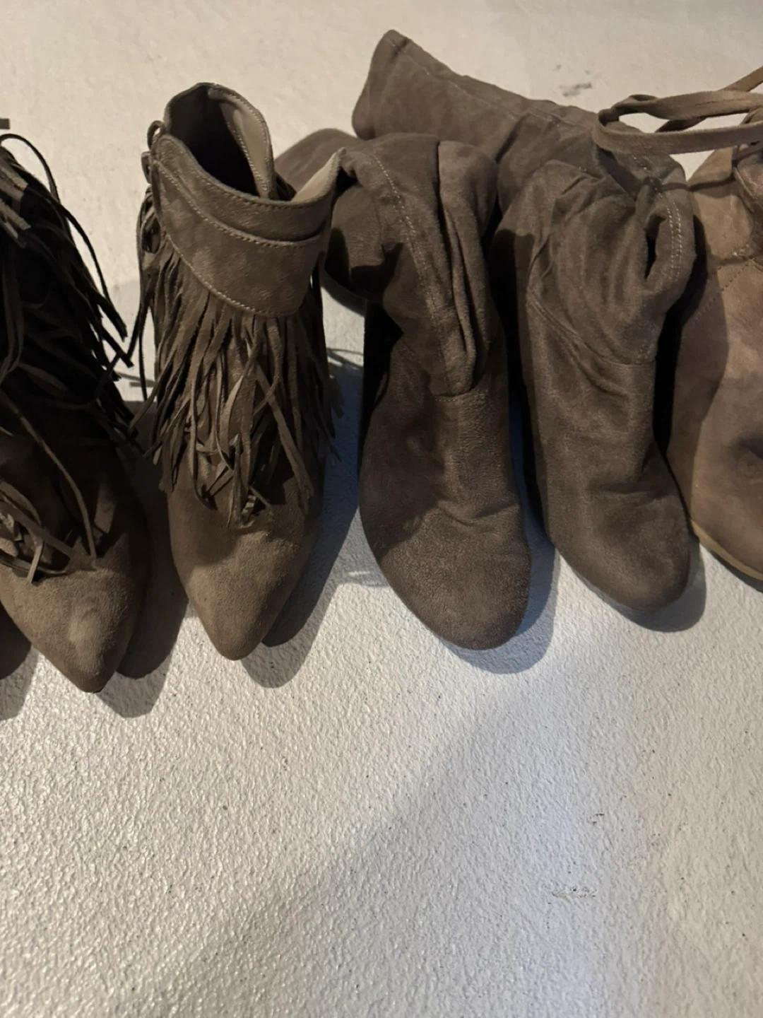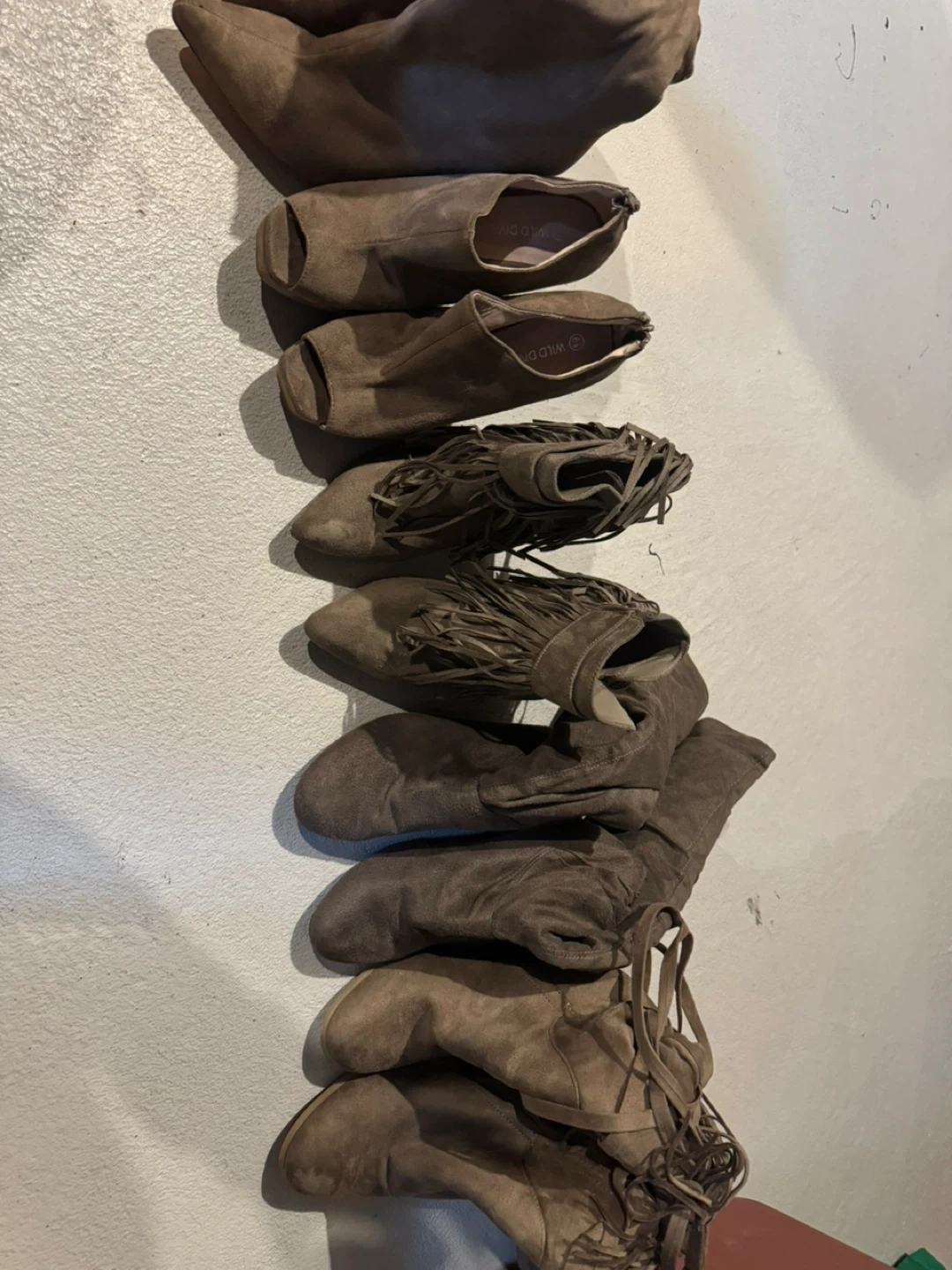 Selling a collection of Wild Diva brown suede boots. There are several styles, including ankle boots, peep-toe heels, and over-the-knee boots. Great for adding a touch of boho chic to your wardrobe! All for 20 or 7 each