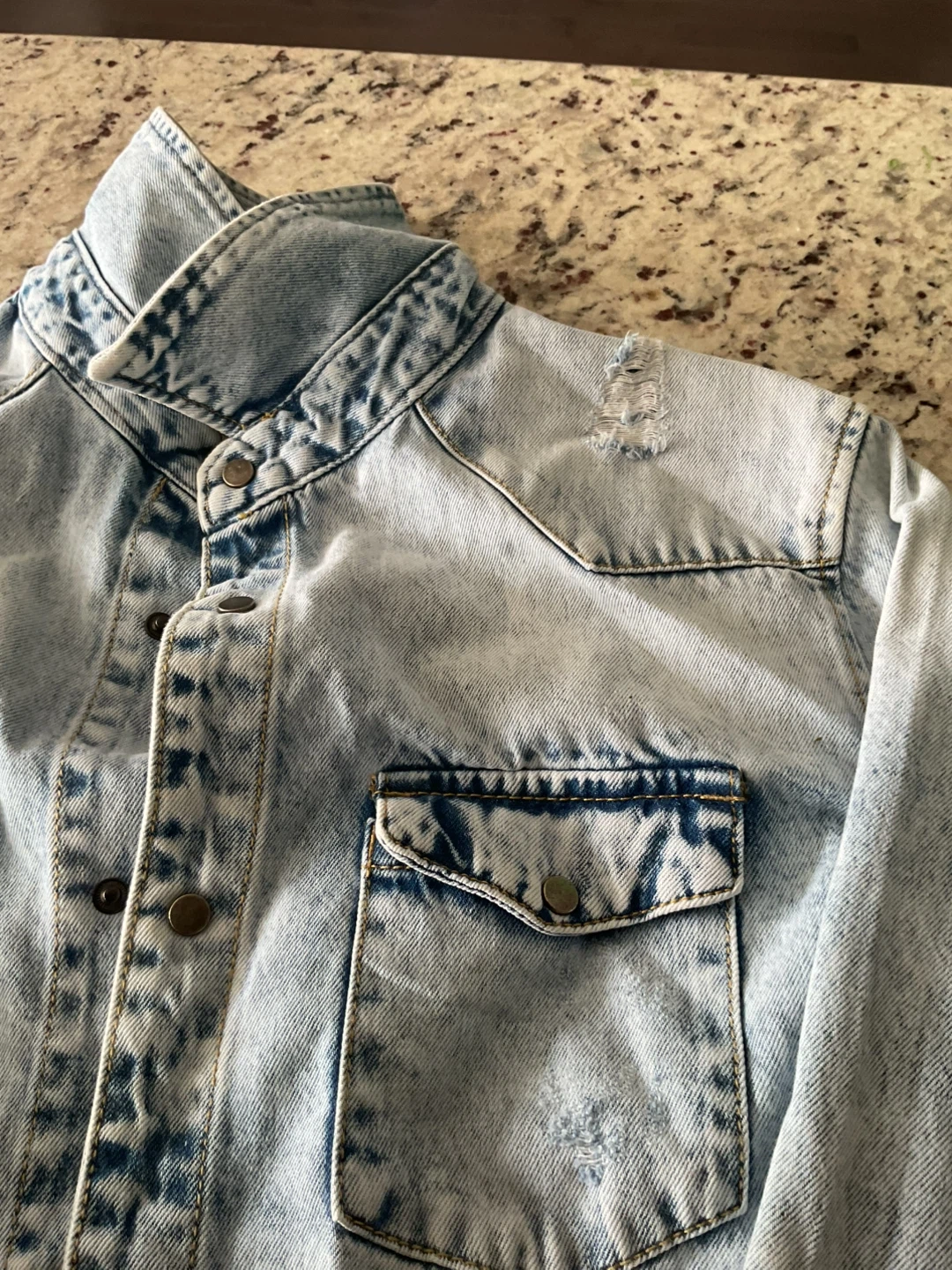 Selling a Wild Horse denim shirt with a unique distressed look. It features a button-down style with chest pockets. There are some stylish rips and tears that add to its character. Perfect for a casual, edgy style!