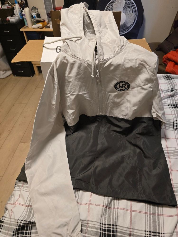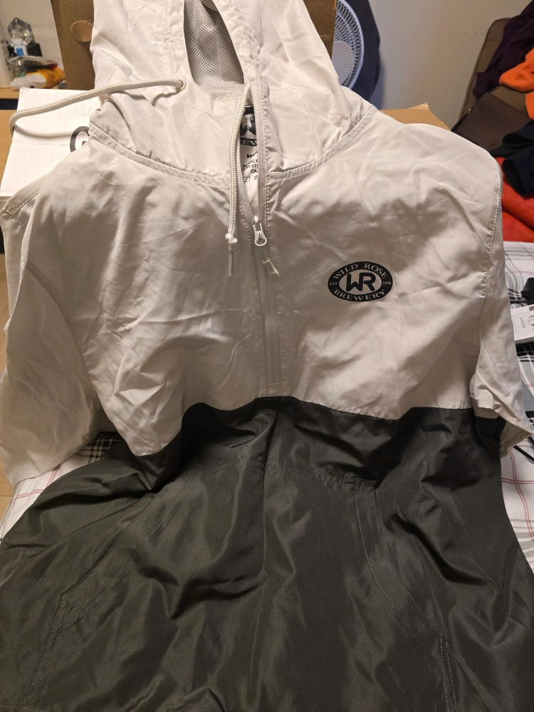 Here's a Wild Rose Brewery windbreaker jacket. It's two-toned, with a light beige top and a dark grey bottom. Great for those breezy days!