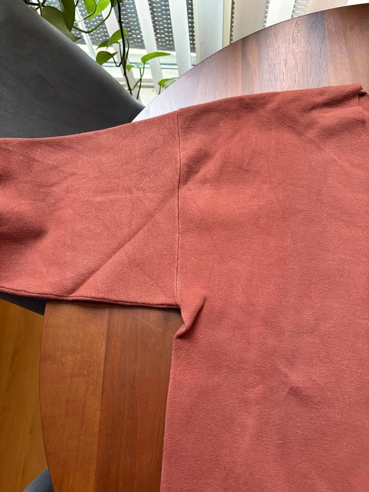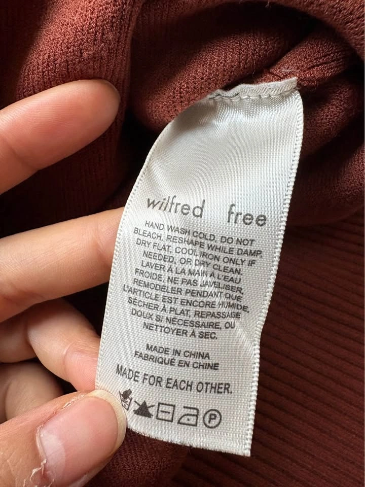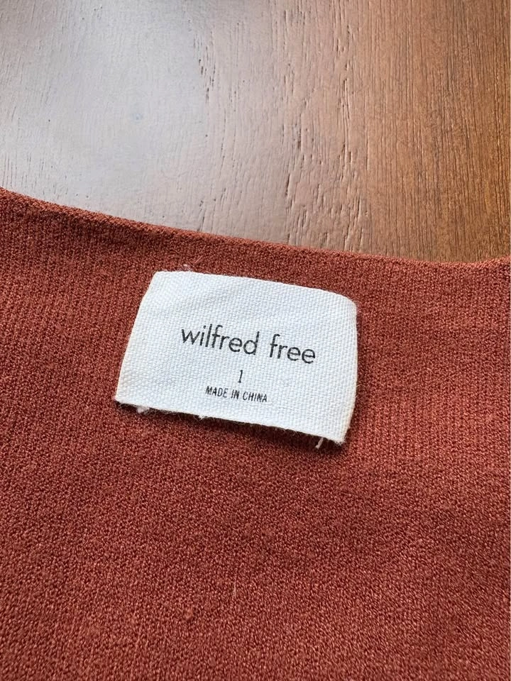 Wilfred 3/4 sweater in burnt orange, size 1 - I’m usually a M and it’s a comfortable, roomy fit. Dropped shoulders, and it’s a beautiful thick weight knit. Sleeves are a wide cut, so very comfy. Flattering V neck in the front. Great condition, no rips/tears/stains. Cash only and pick up only near Yonge & Davisville.