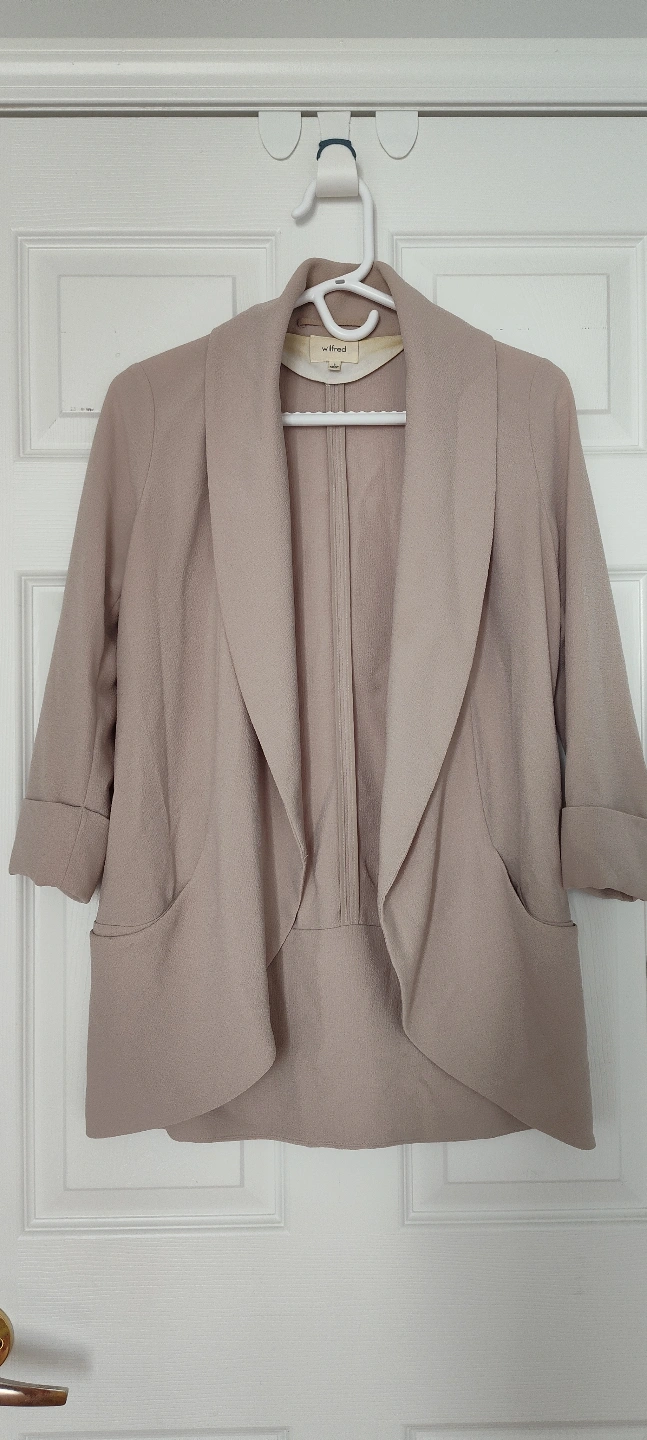 Lightweight blazer. Open front. Three-quarter sleeves. Neutral colour. Great for layering. Check out my other listing. There may be something else you're also interested.