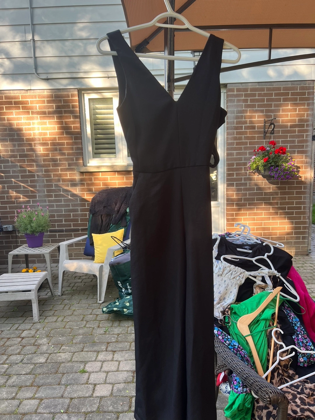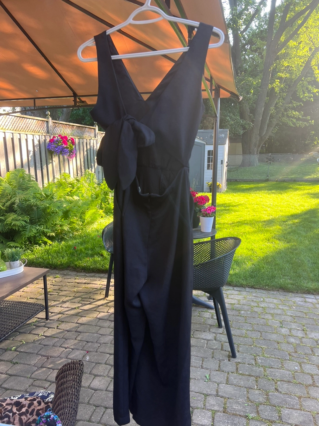 Beautiful black jumpsuit. Features a flattering fit and a back bow detail. The jumpsuit includes a zipper closure.