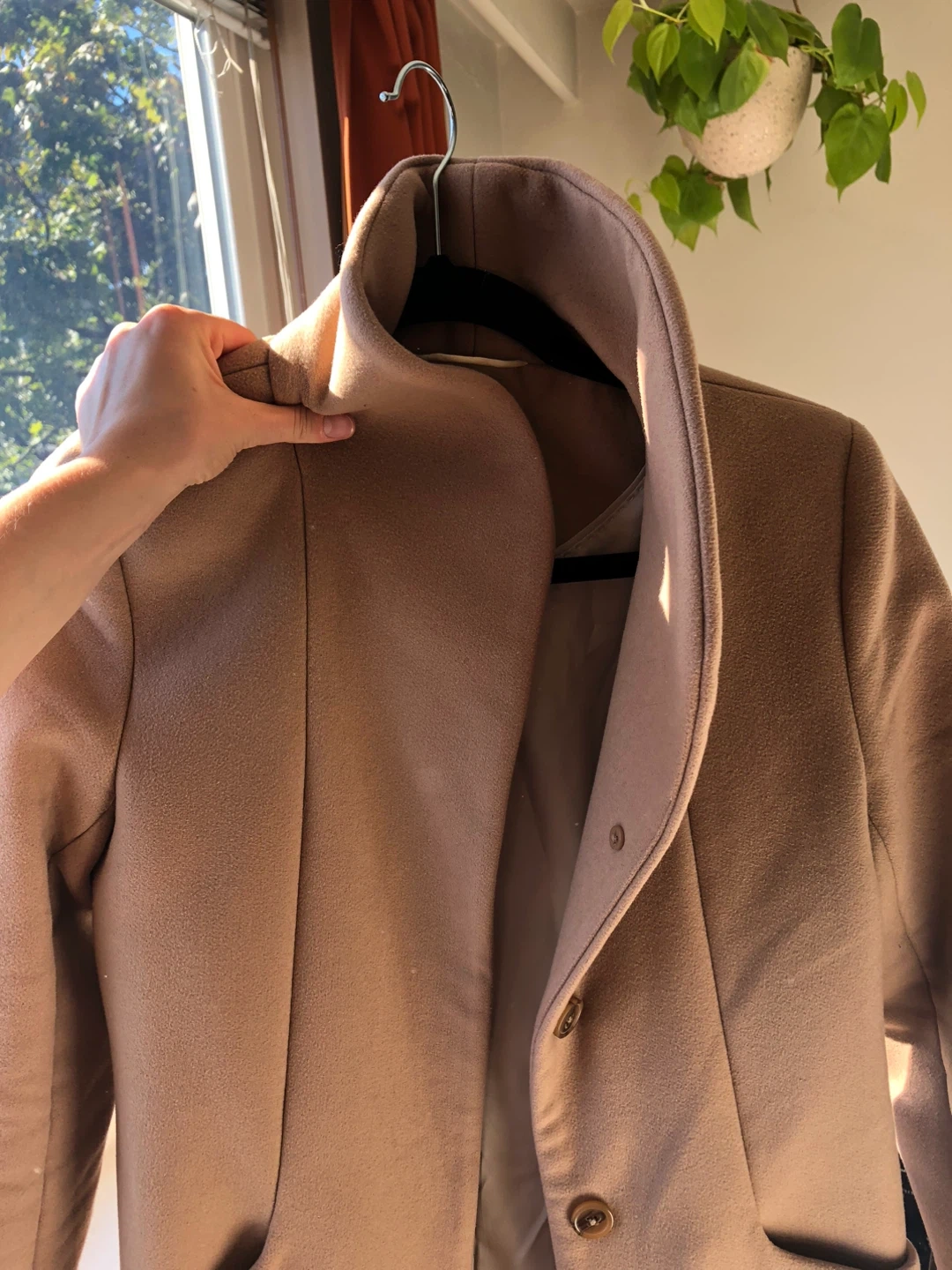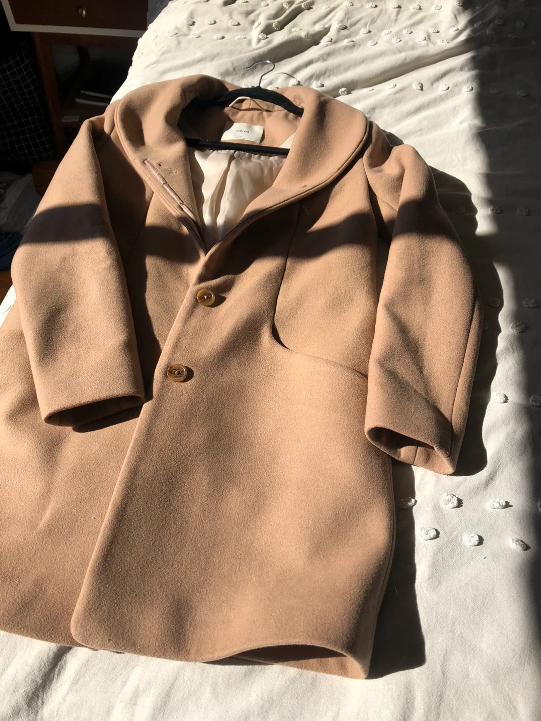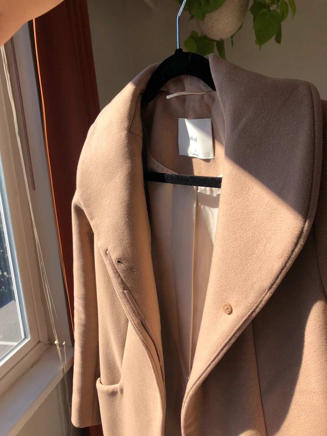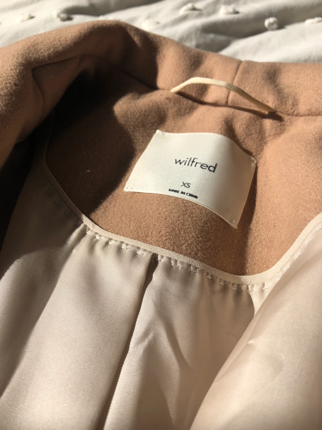 Cozy and stylish beige wool coat from Wilfred in size XS. It's in excellent condition (minor stain on lining, but not visible, and will likely come out with a dry clean). Very warm - perfect for crisp fall and winter days coming and can be dressed up for more formal occasions or dressed down to just wear casually.