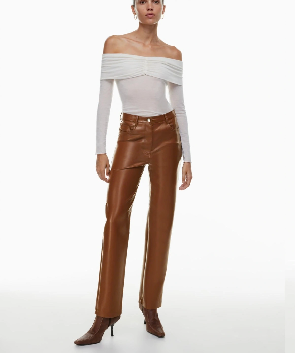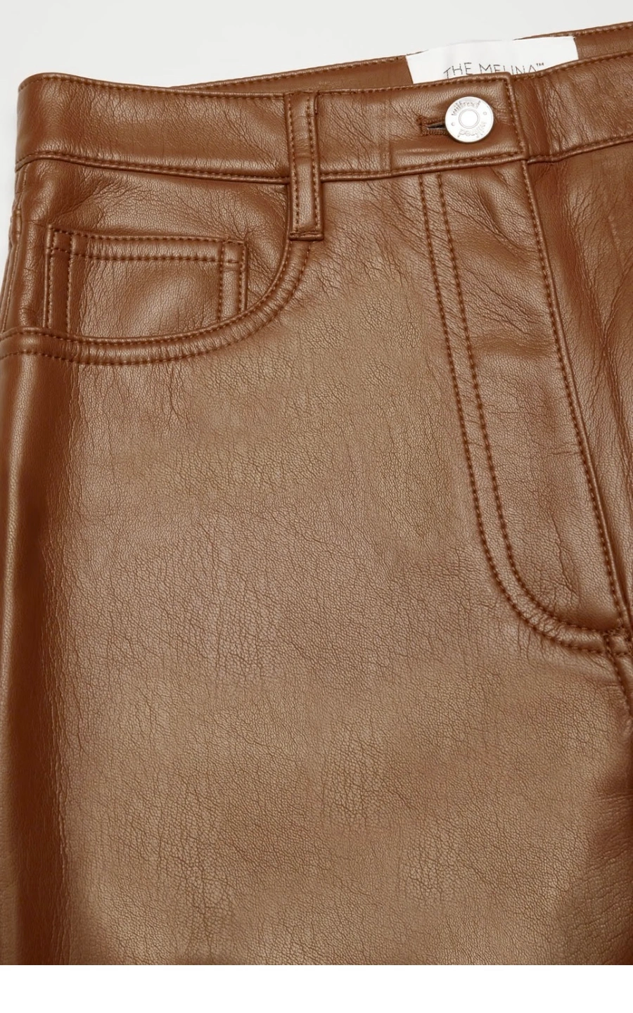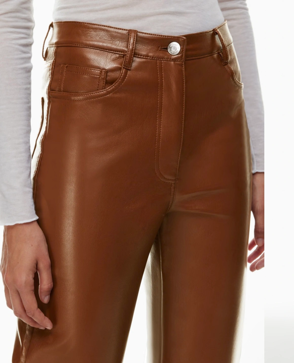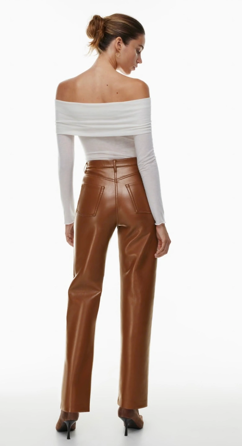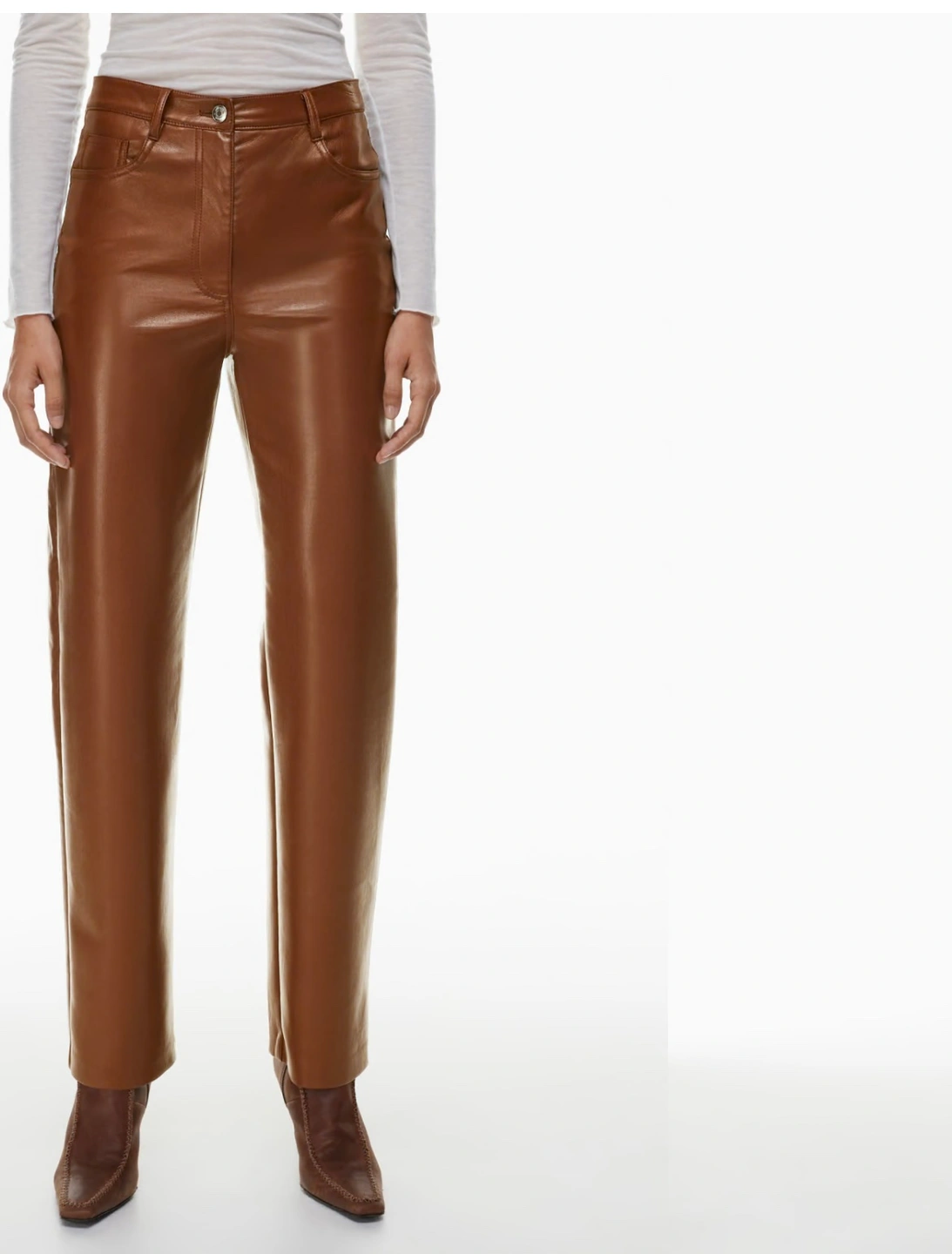 High waisted, straight leg vegan leather pants . Features five pockets, a button and zip fly closure, and a relaxed fit. These pants are perfect for dressing up or down.