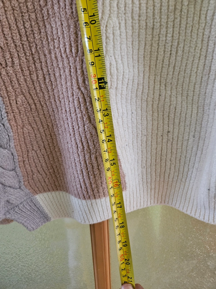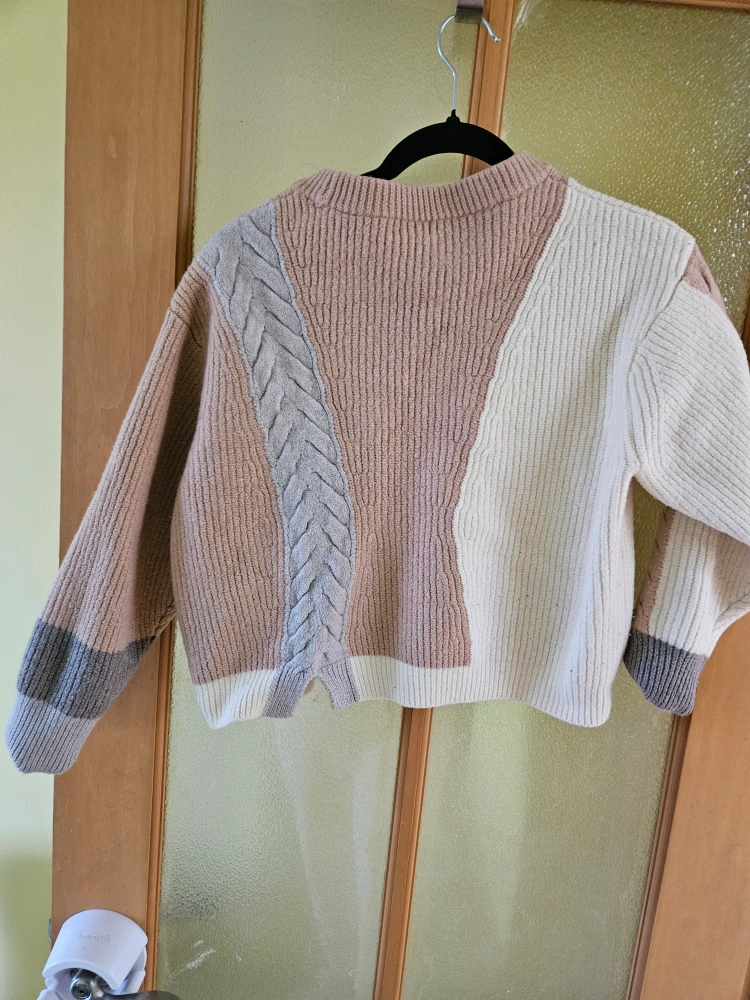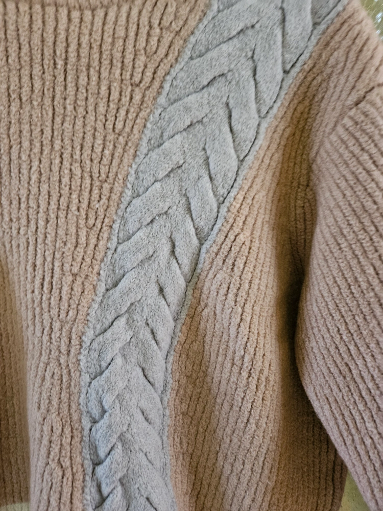 Cozy Wilfred Free sweater in a stylish colour block design! It features a unique cable knit pattern and is a size large. Perfect for adding a touch of warmth and style to your wardrobe