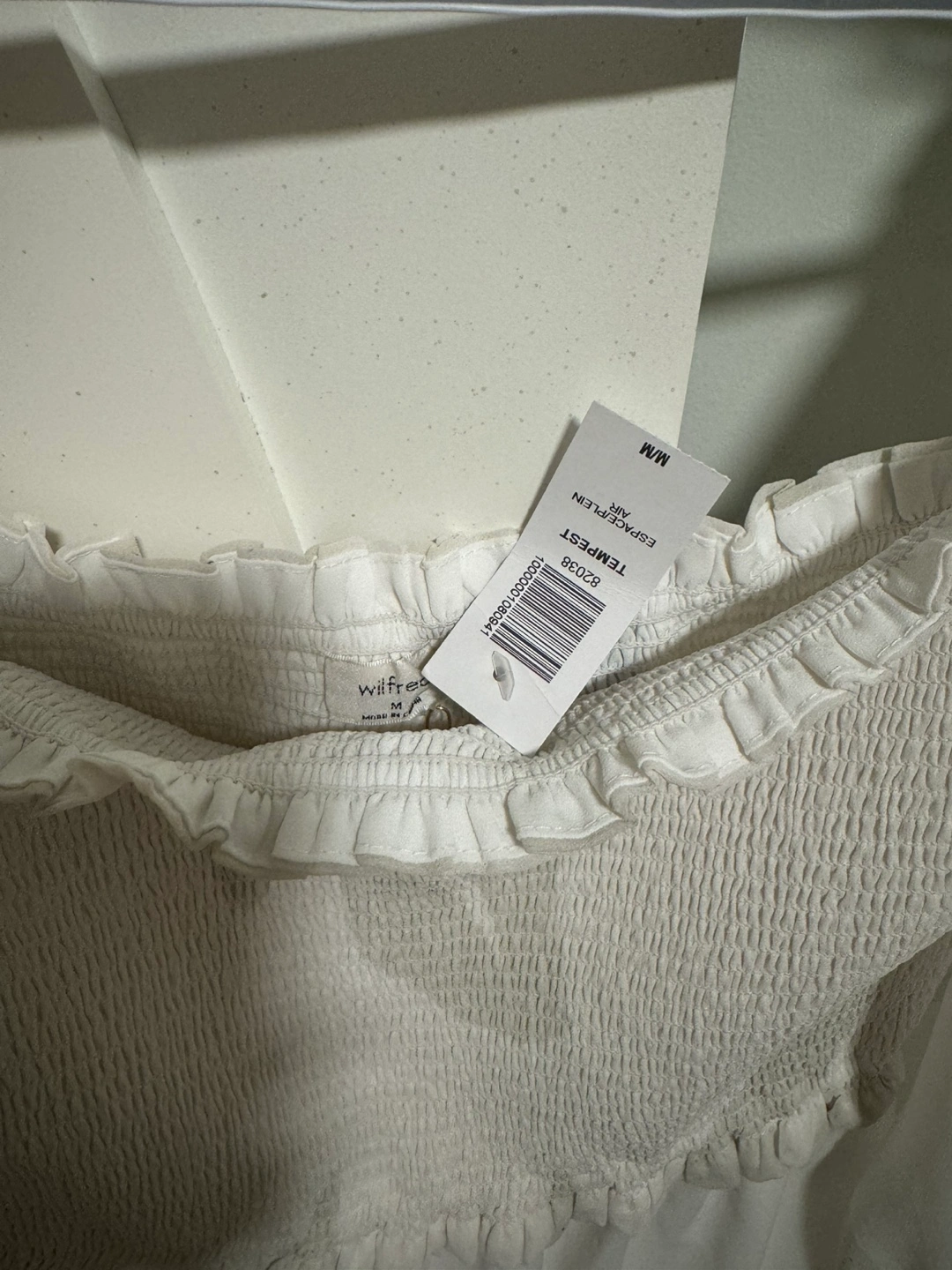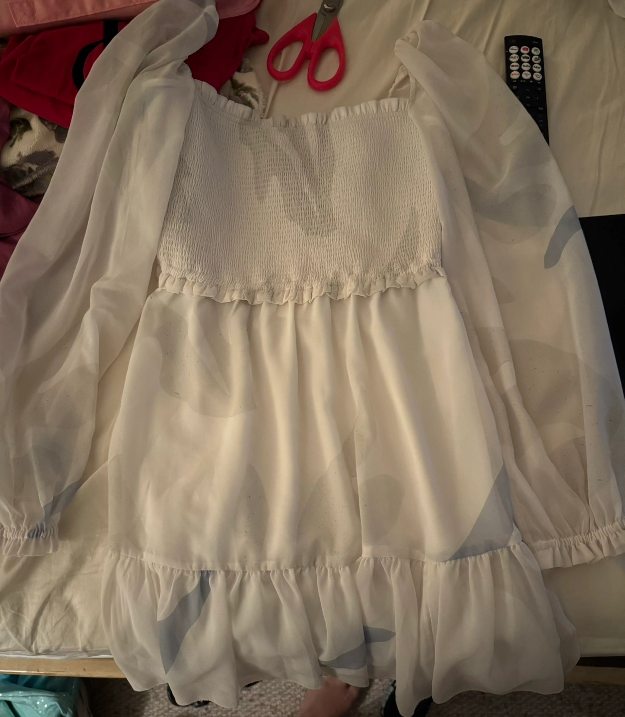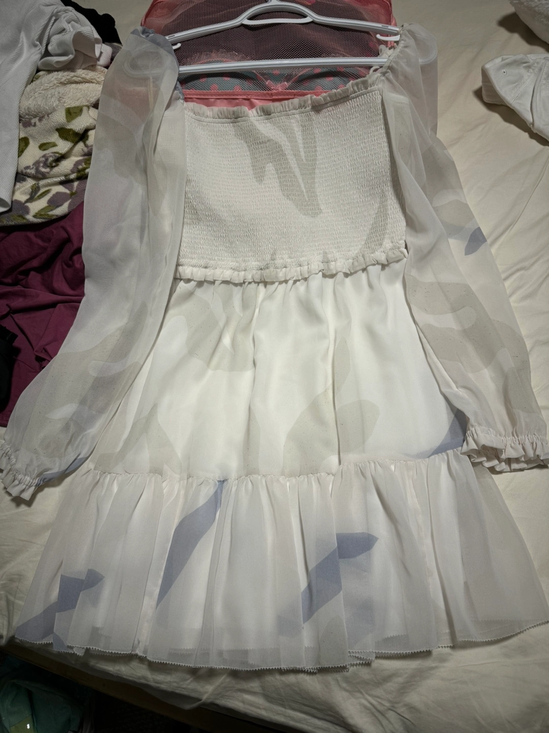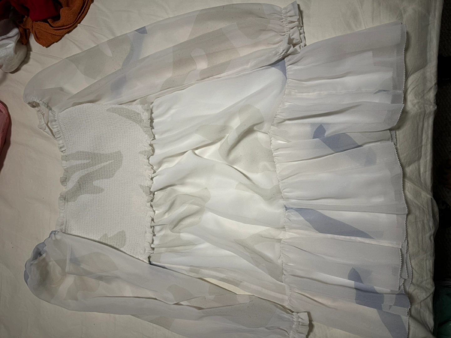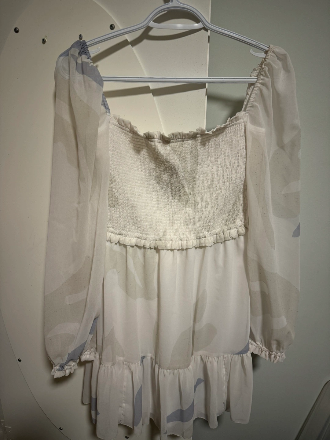 Beautiful off-the-shoulder mini dress. Features long sheer sleeves and a smocked bodice. Light coloured abstract print. Layered skirt.