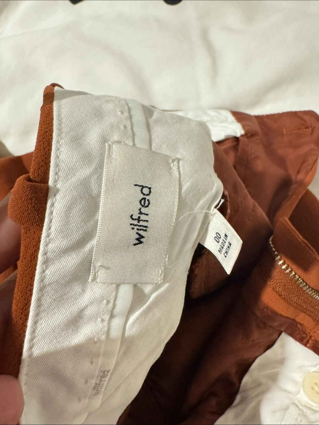 Selling a pair of Wilfred Free trousers in size 00. The colour is a lovely rust shade. They're in great condition and ready for a new home!