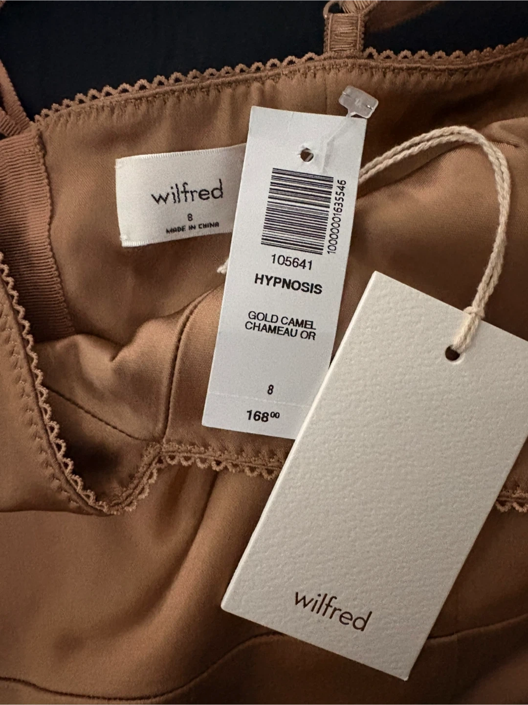 Selling a Wilfred Hypnosis dress in a beautiful gold camel colour, Silky and smooth texture. It's a size 8 and in great condition! The original tag shows it was bought for $168, but was never worn.