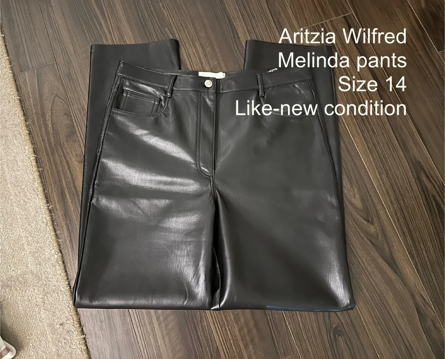 Selling a pair of Wilfred Melina pants in a like-new condition! These pants are a size 14 and made of 100% polyurethane face and 100% polyester back. They are a stylish addition to any wardrobe!
