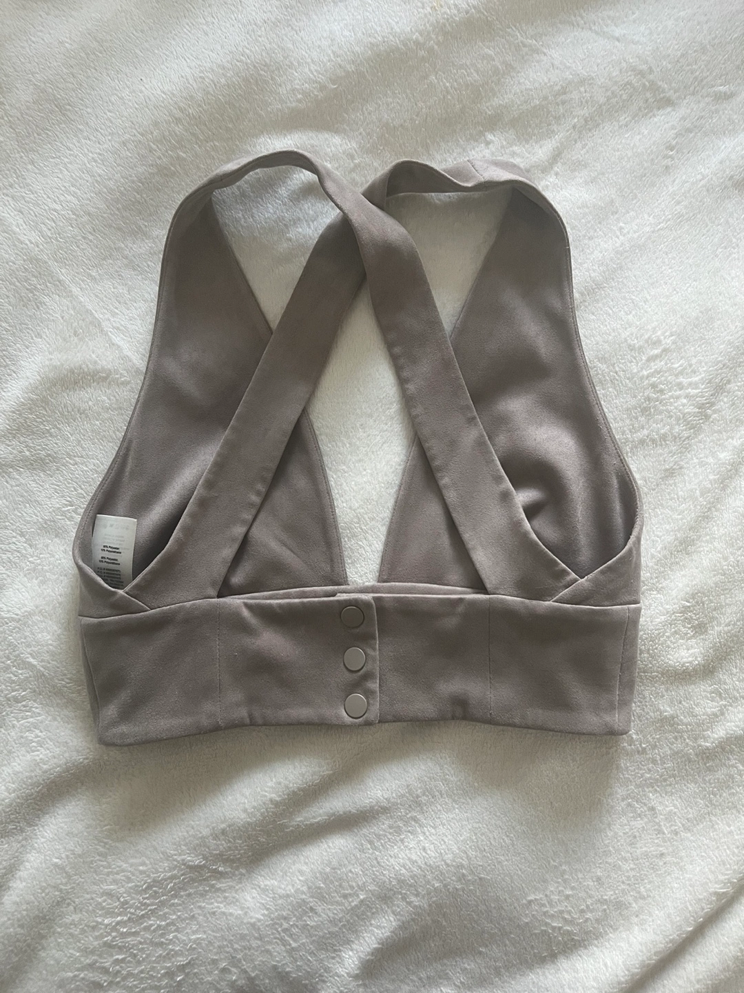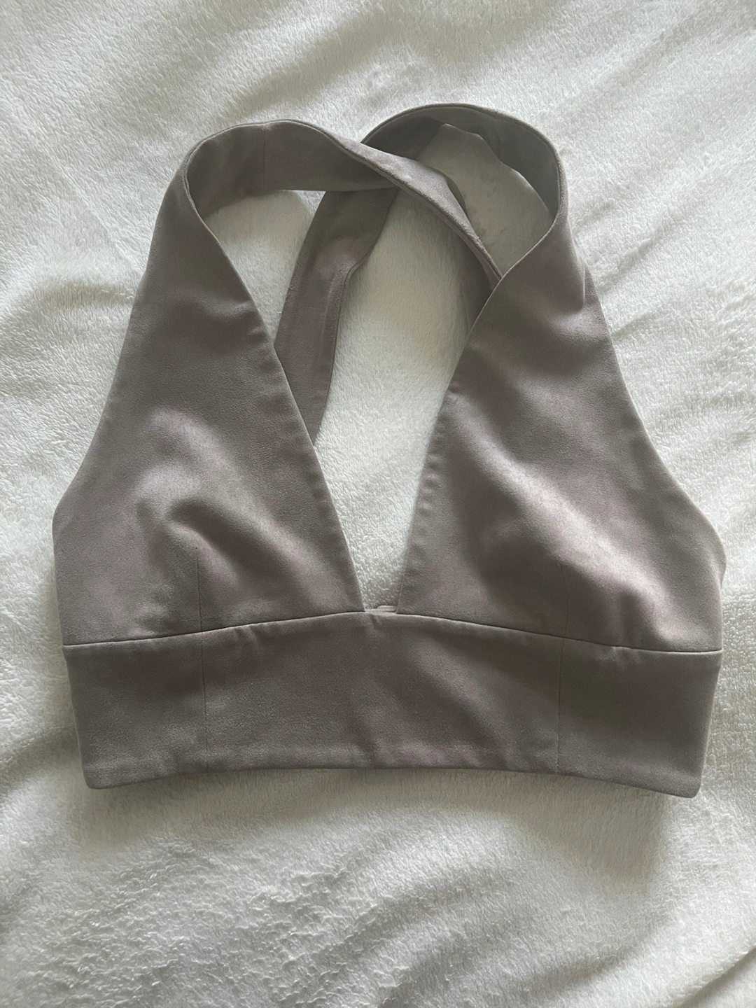 Selling a Wilfred halter top in size 4. It's in great condition and features a unique criss-cross back design. The material is soft and comfortable, suede-like, perfect for a casual outing or dressing up for a night out!