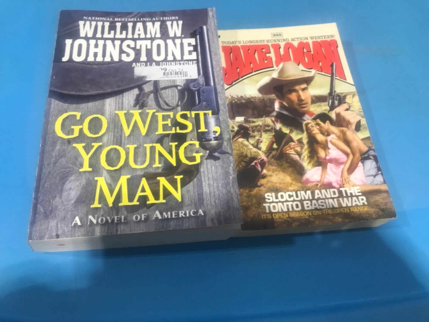 Two western novels for sale: - 'Go West, Young Man' by William W. Johnstone and J.A. Johnstone - 'Slocum and the Tonto Basin War' by Jake Logan No holds FCFS x posted Cash and pickup only