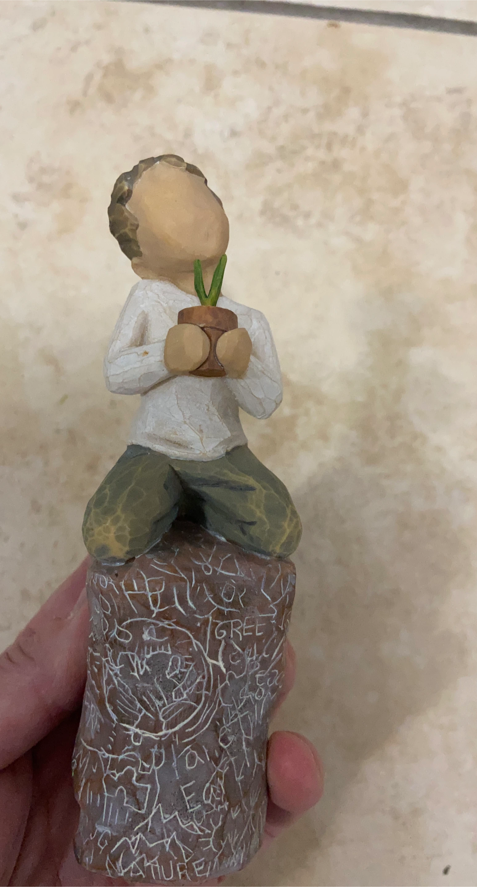This is a Willow Tree figurine titled "Something Special"! It features a kneeling figure holding a small potted plant. The base has etched designs and the word "Grateful". It's in great condition and would be a lovely addition to any collection