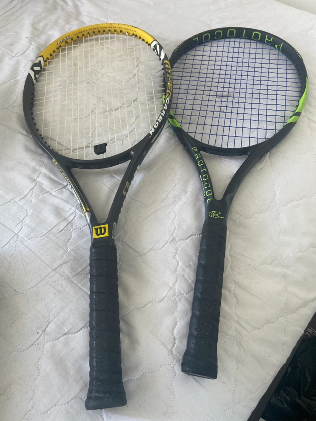 Selling a Wilson Hyper Hammer tennis racket. It comes with a case for easy storage and transport. The racket shows some signs of use but is still in good playing condition. Also included is a second tennis racket, a Protocol Solinco.