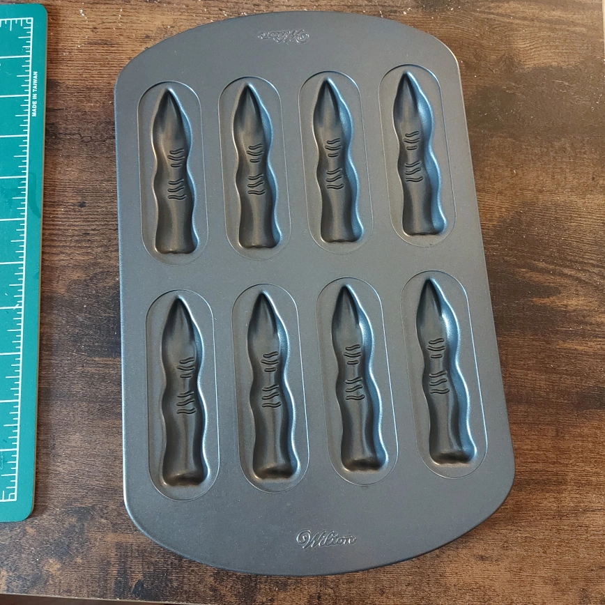 Used baking pan for making creepy witch finger cookies for halloween. Eight cavities in the shape of fingers. Used once. Selling because I don't forsee myself using it again. Pick up at Pape Station.