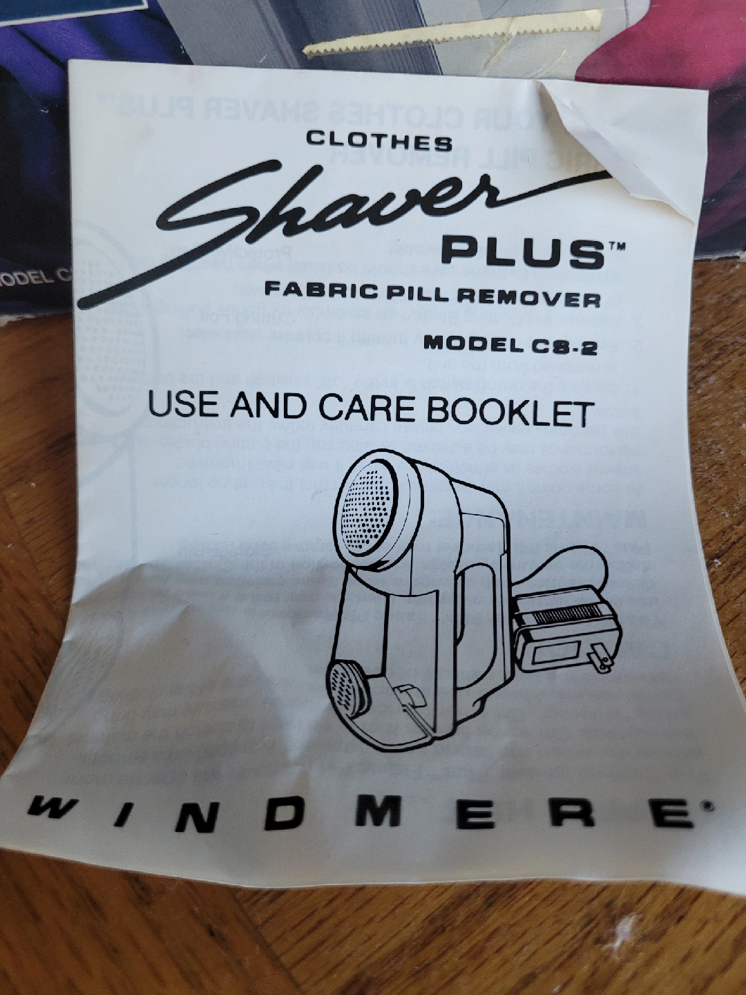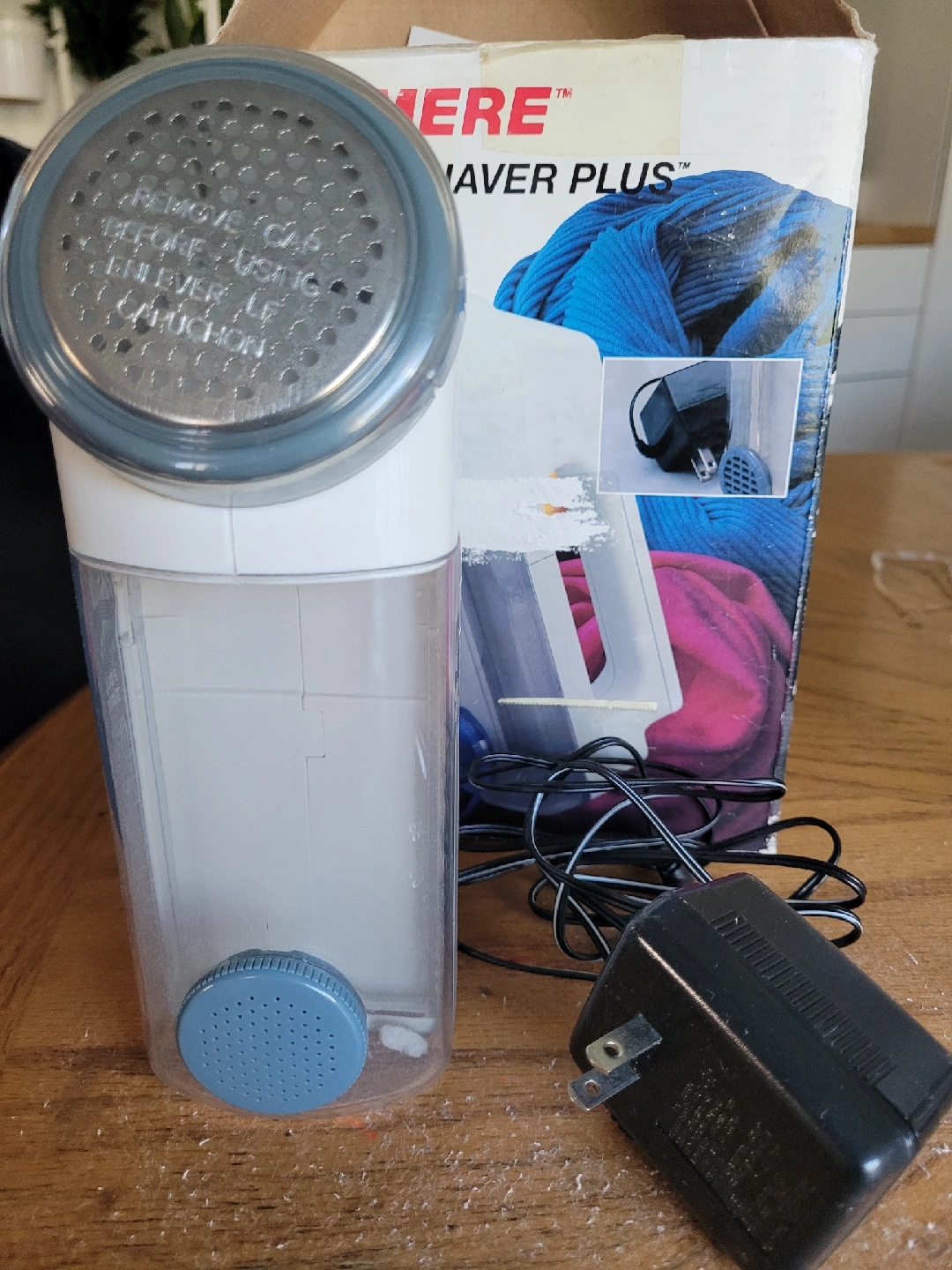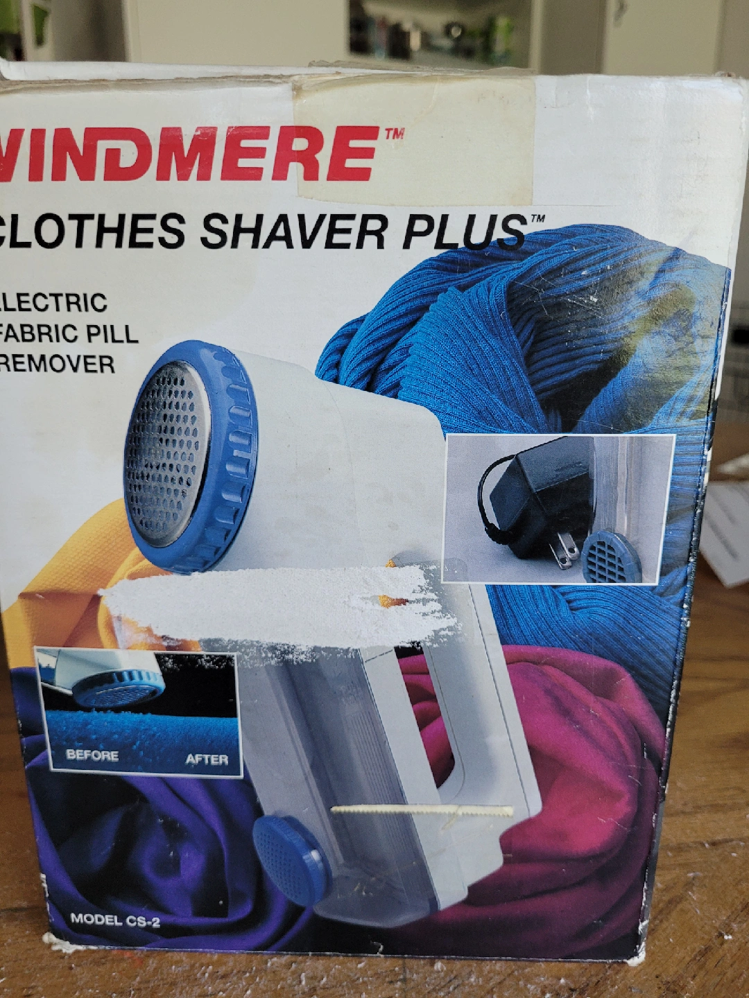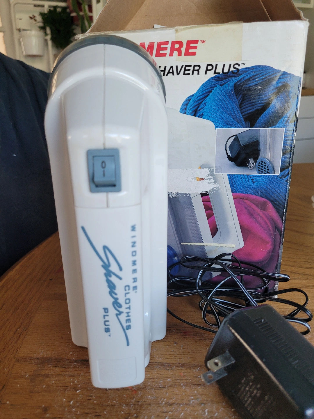 Gently used Windmere Clothes Shaver Plus fabric pill remover. It comes with the box, charger, and instructions. Great for keeping your clothes looking fresh and new! Box battered but items inside NEVER USED.
