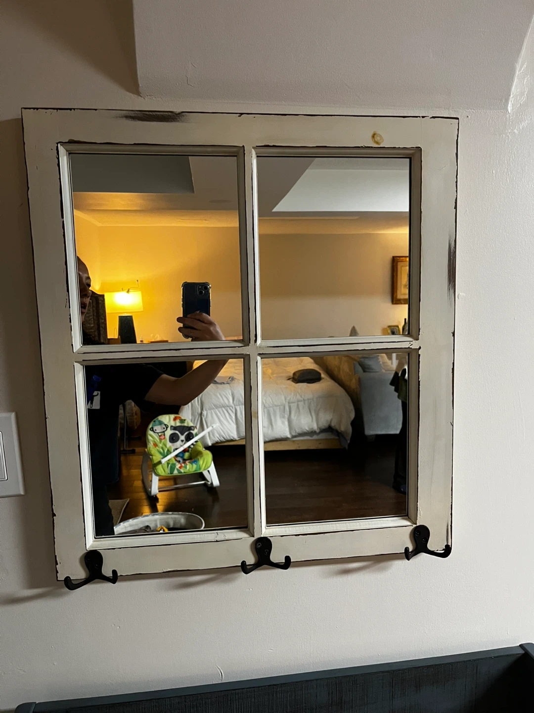 Selling a charming window pane mirror complete with hooks! The mirror is framed by a distressed white window pane, giving it a rustic feel. Pick up only Cash only