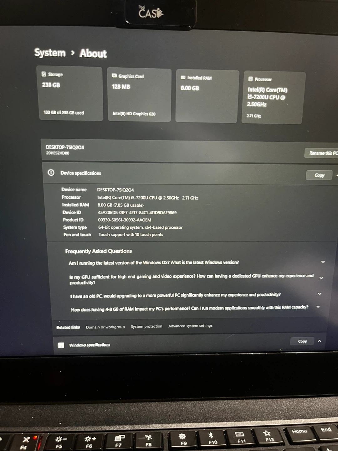 Selling a Lenovo ThinkPad T470s laptop in black. It comes with an Intel(R) Core(TM) i5-7200U CPU @ 2.50GHz processor, 8.00 GB of installed RAM, and 238 GB of storage. Great for work or school!