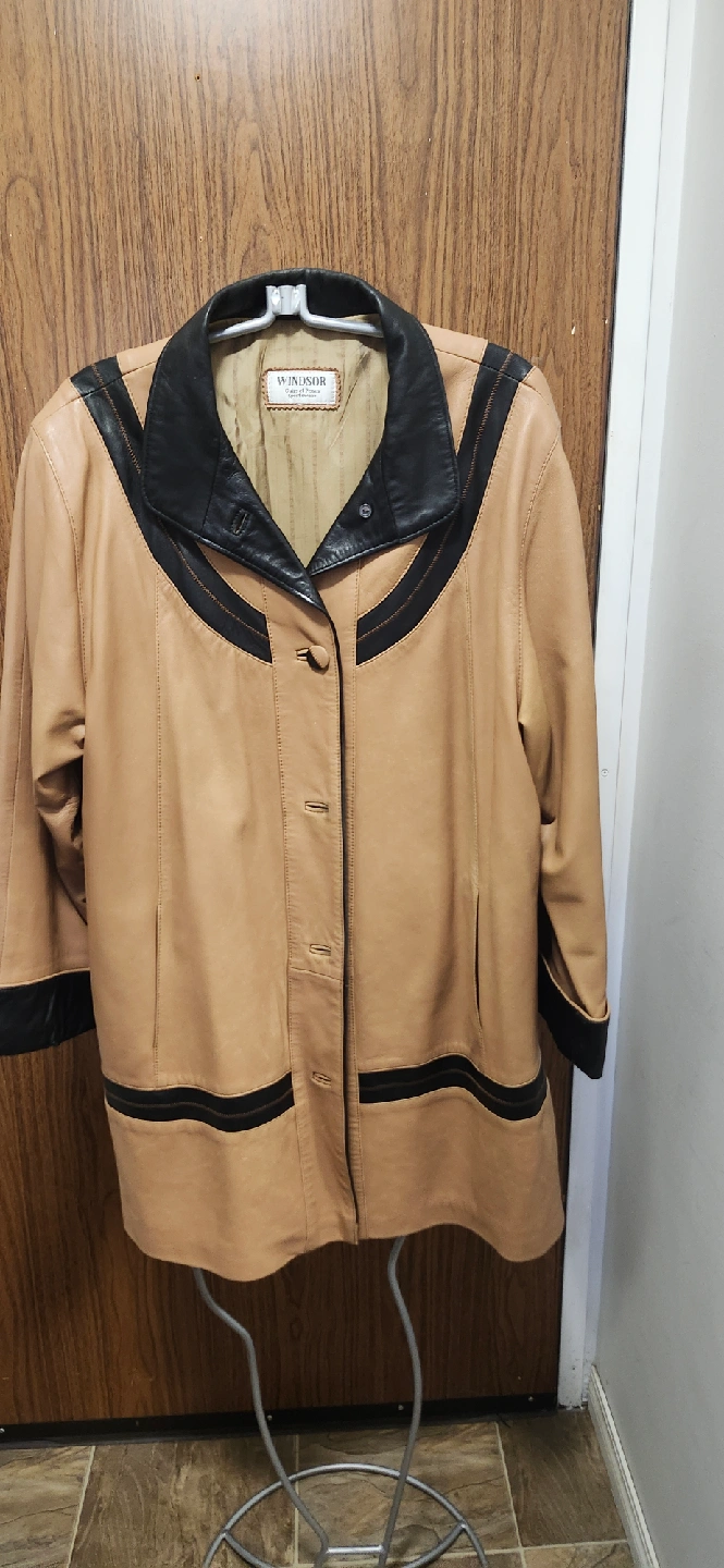 Here's a stylish Windsor jacket made from 100% lamb leather! It has a unique design with black accents. A great addition to any wardrobe! It's about an XXL, or sz 16 to 18.
