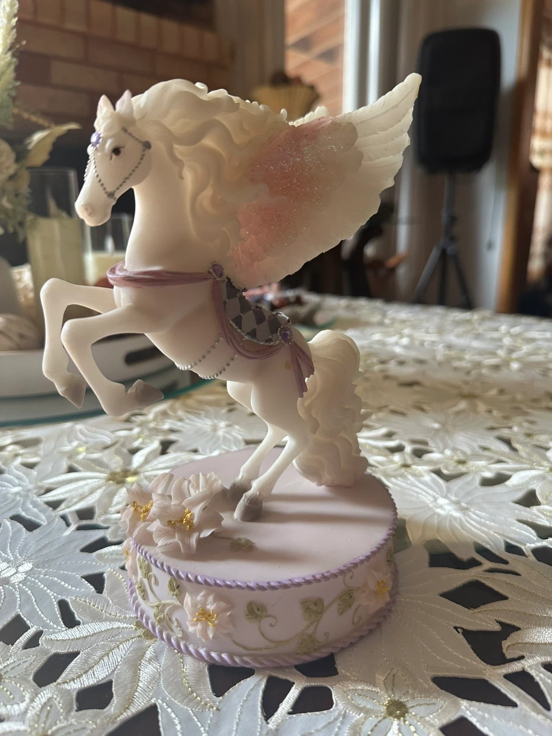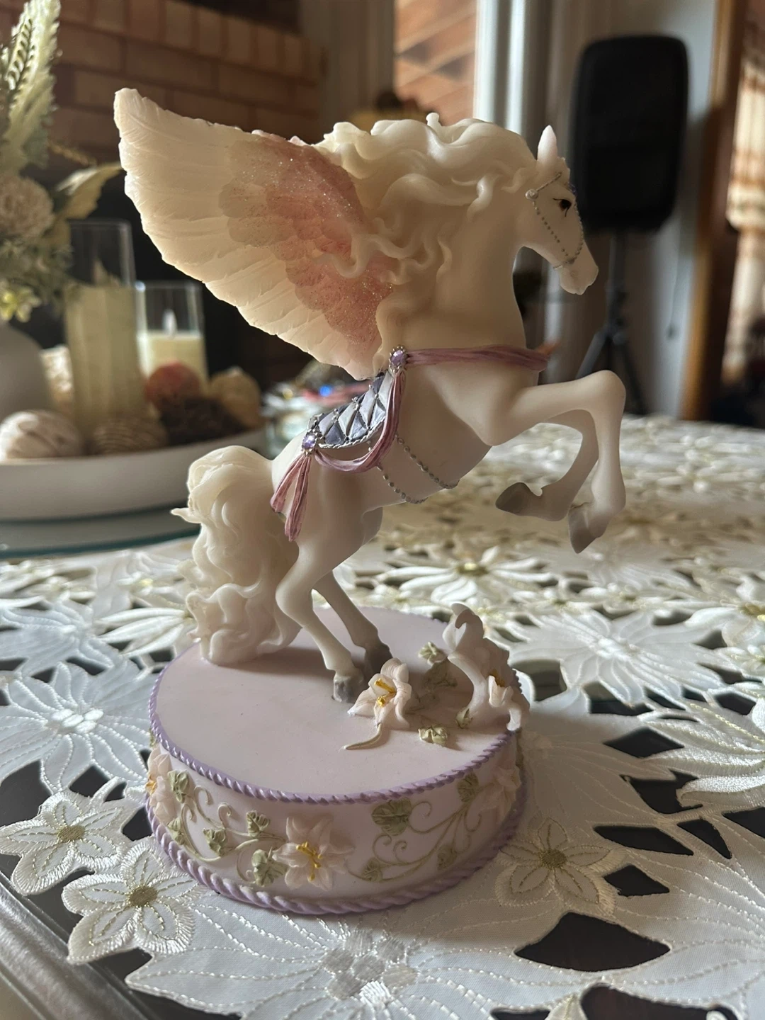 A beautiful winged horse figurine in excellent condition. It features delicate floral details and a soft colour palette, making it a lovely addition to any collection or room decor