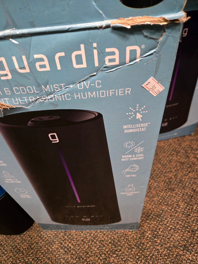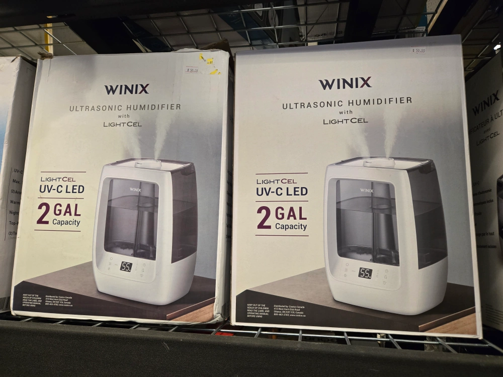 Humidifiers for sale. One Winix model, 2-gallon capacity with UV-C LED. One PureGuardian model, 1.5-gallon capacity, warm & cool mist, top fill. Both in box, some box damage.