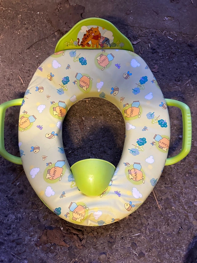 Give your little one a comfortable and familiar place to do their business with this Winnie the Pooh-themed toilet training seat. It's in good condition and ready to help your child transition to the big potty! It's got handles and a secure fit for most toilets. * Padded for comfort * Easy-grip handles * Winnie the Pooh design Looking to make potty training a bit more magical? This seat is ready to bring some Hundred Acre Wood charm to your bathroom. And remember, if the ad is still up, it's still available! I'm estimating the value of this item at $10 CAD. It's priced to go to a good home!