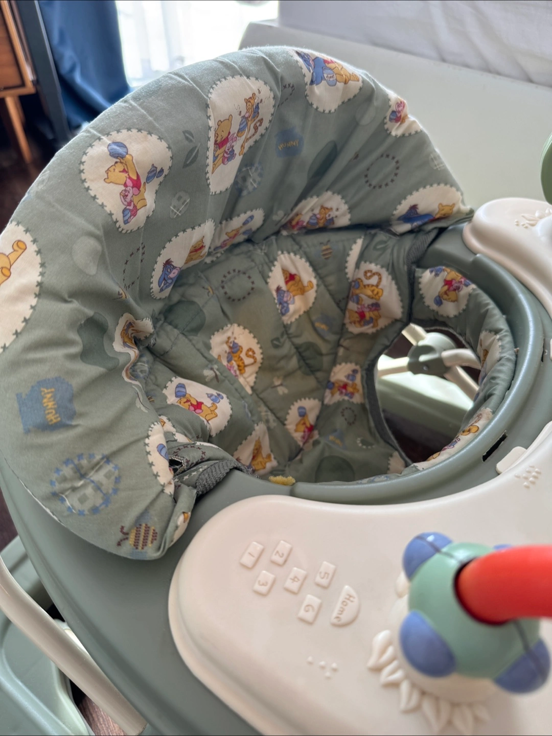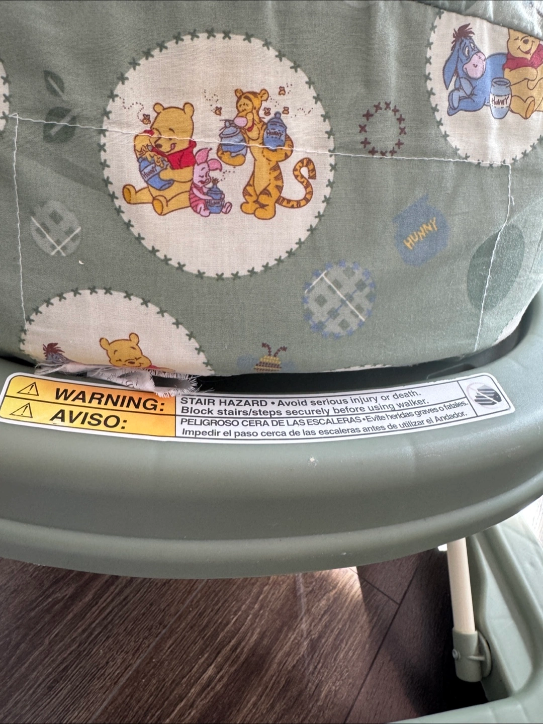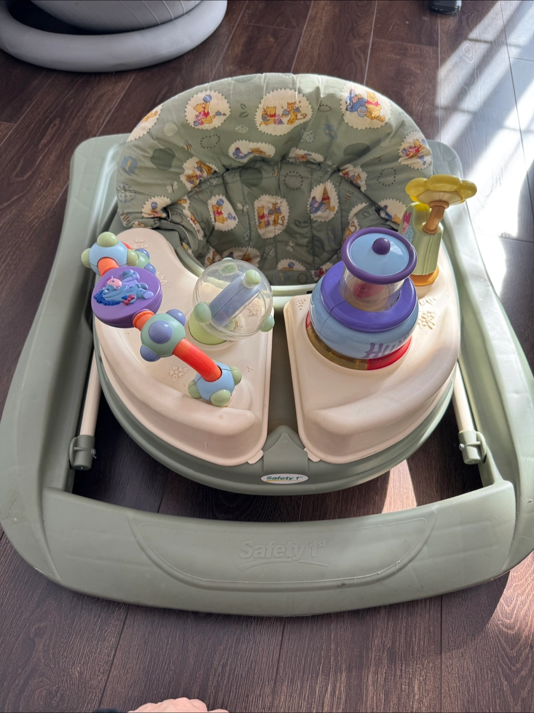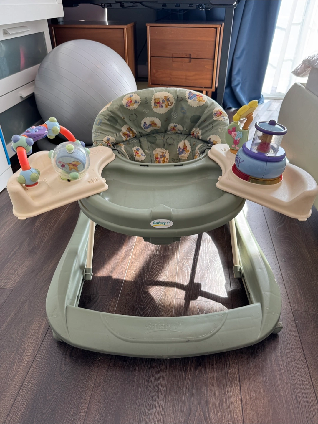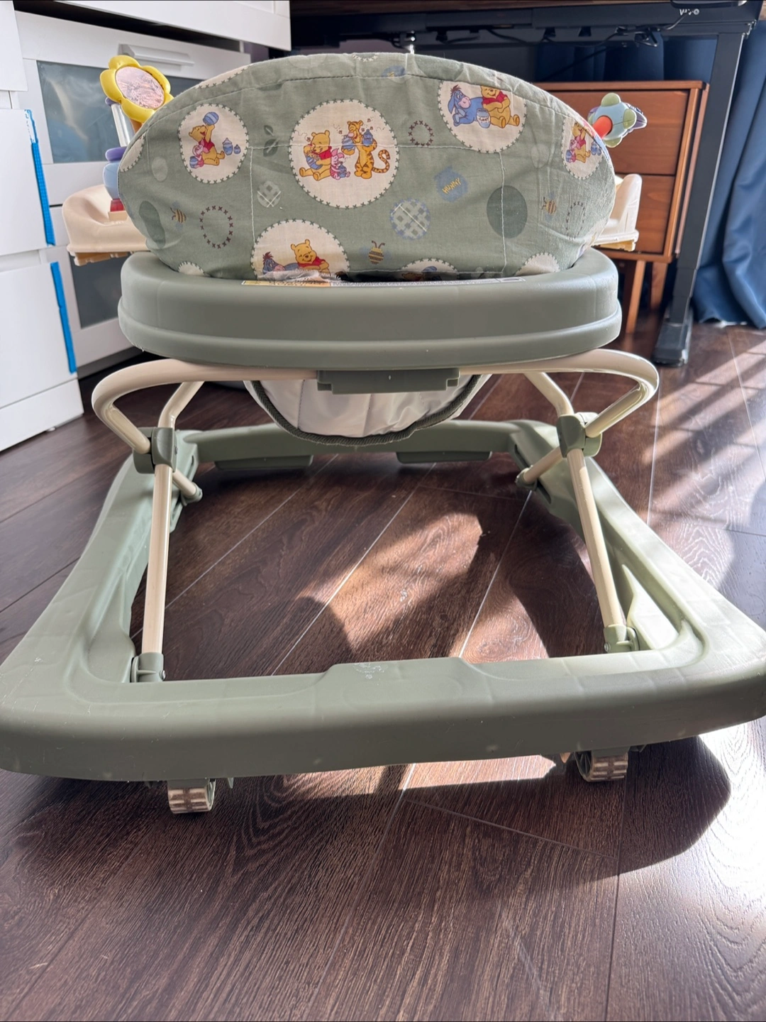 Used baby walker. Features Winnie the Pooh theme. Green and beige colour scheme. Includes activity toys. Folds for storage. 2 adjustable height