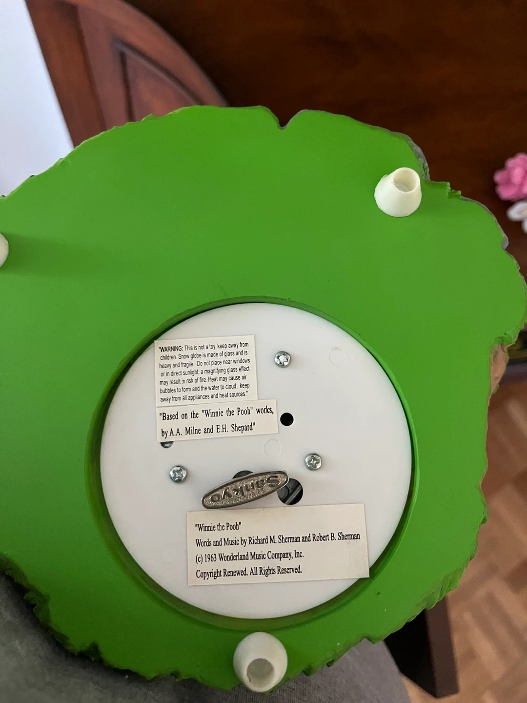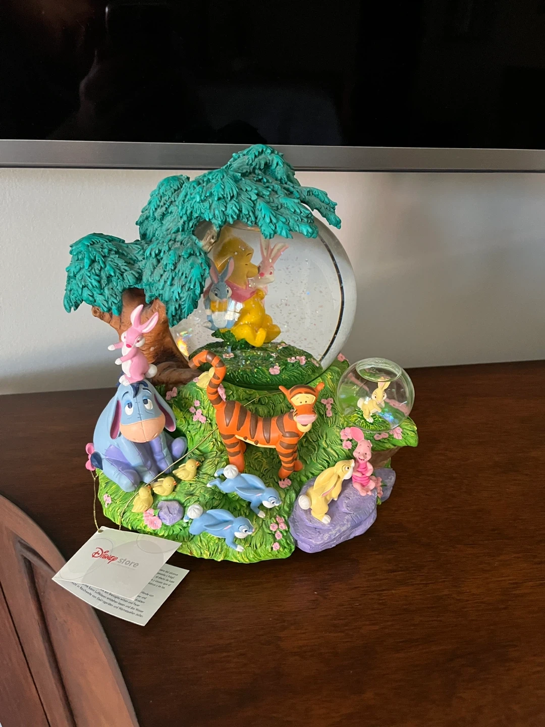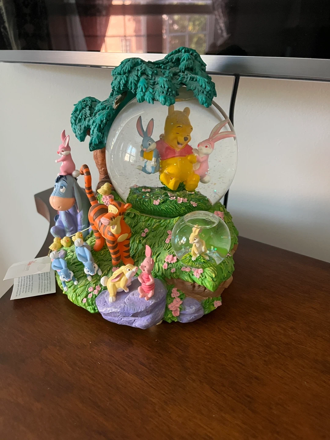 Selling a charming Winnie the Pooh snow globe music box! It features Pooh and friends in a delightful scene. The base is decorated with flowers and greenery, and the snow globe contains glitter for a magical effect. The music box plays "Winnie the Pooh" when wound up, adding a touch of nostalgia Piglet missing an ear