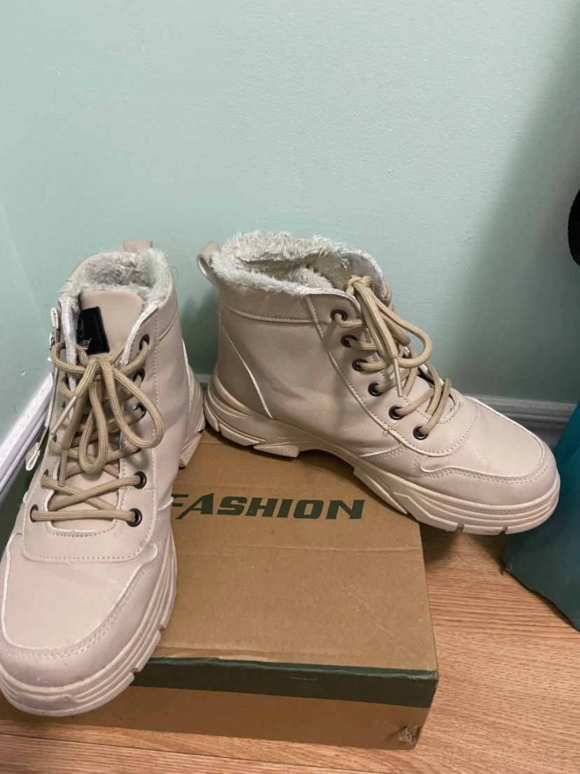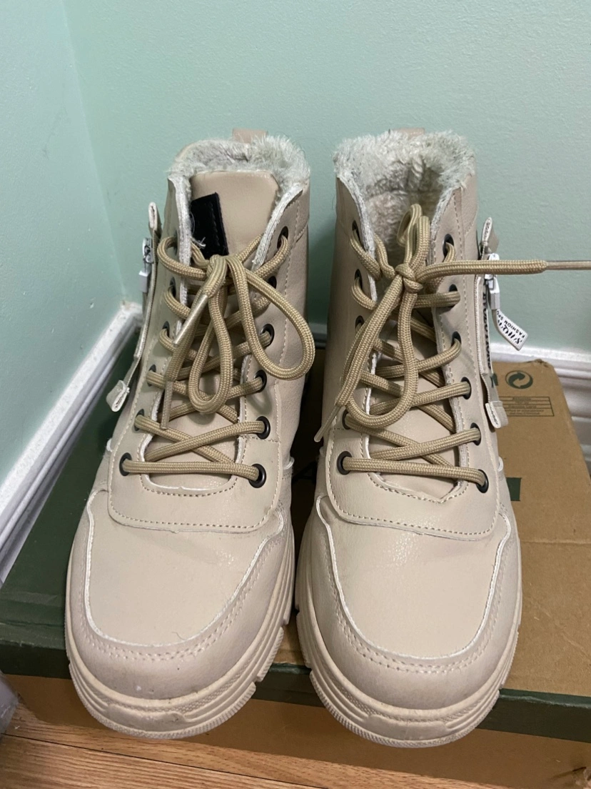 fashionable winter boots, neutral beige colour and have a cozy faux-fur lining to keep your feet warm. Perfect for those chilly Canadian days!