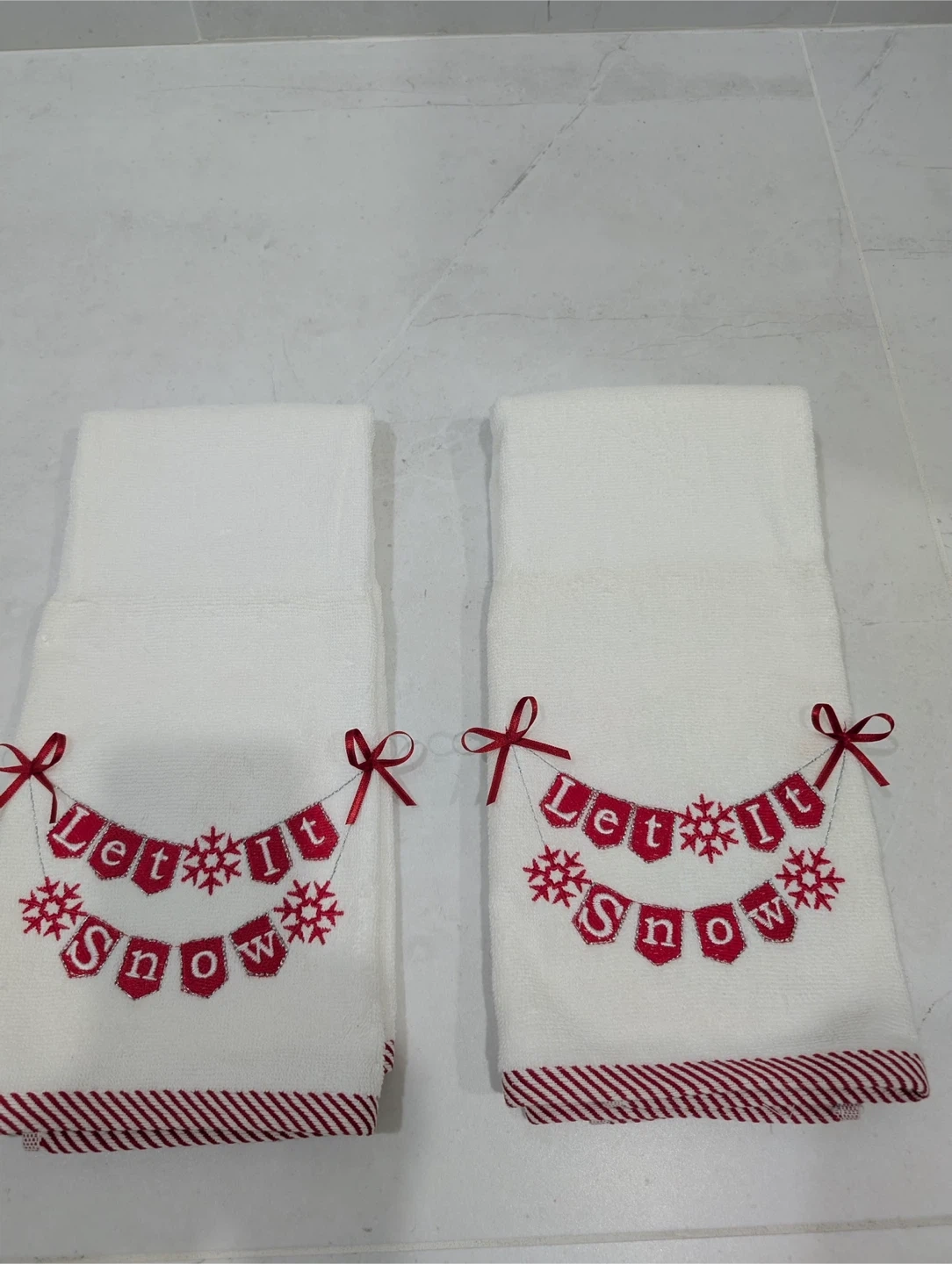 Selling a set of two Winter Dreams hand towels. They're made of 100% Turkish cotton and feature a cute 'Let It Snow' design with red embellishments. Perfect for adding a festive touch to your bathroom or kitchen!