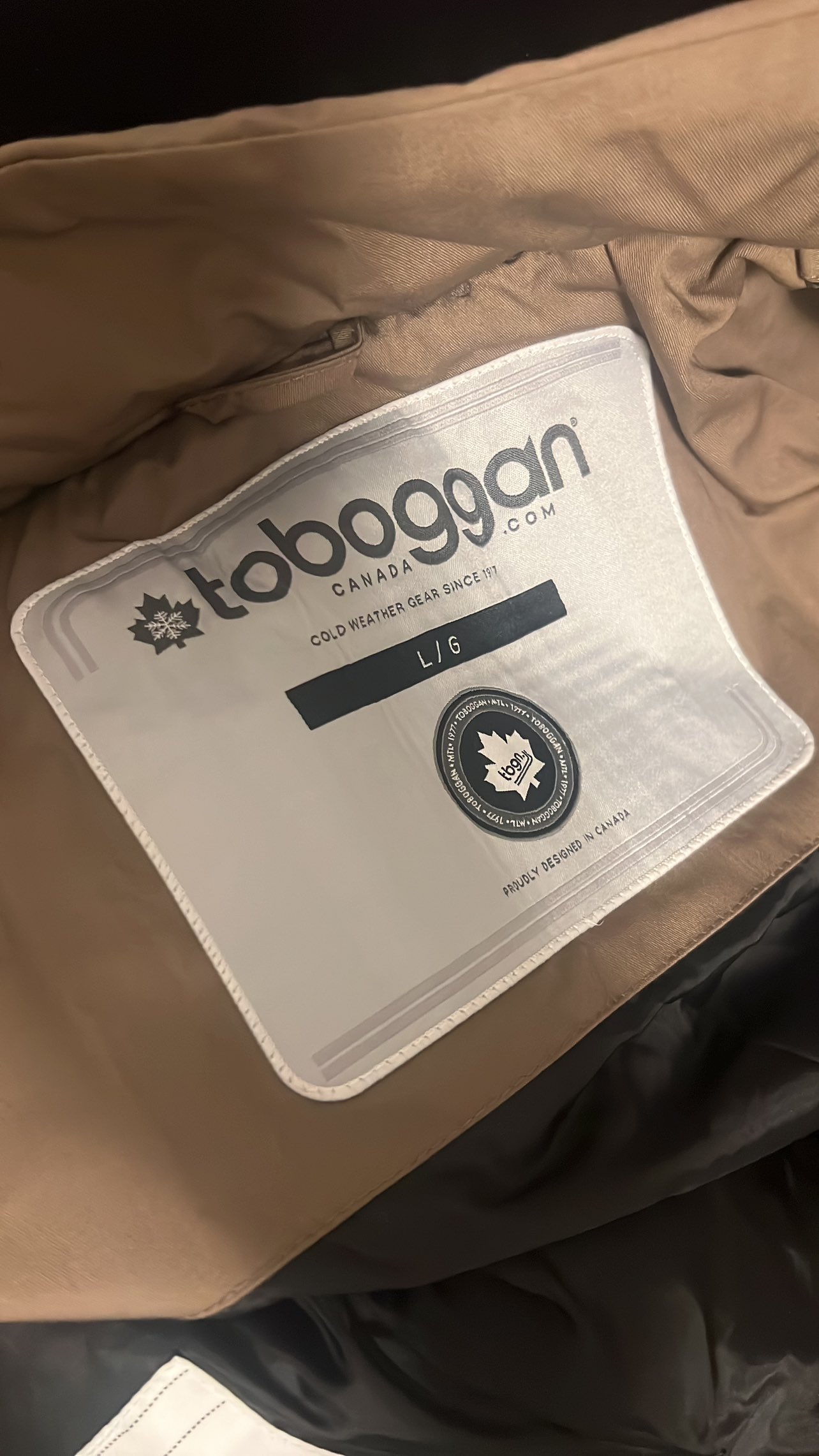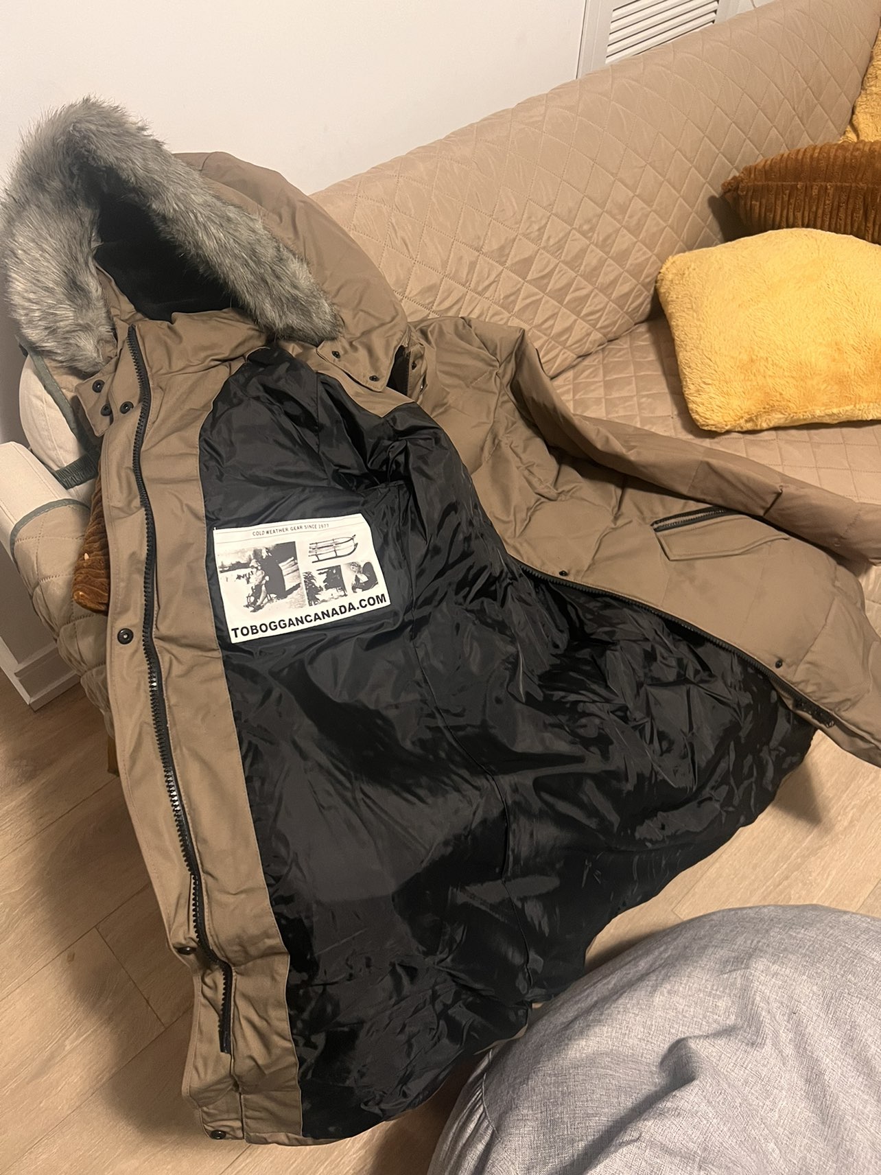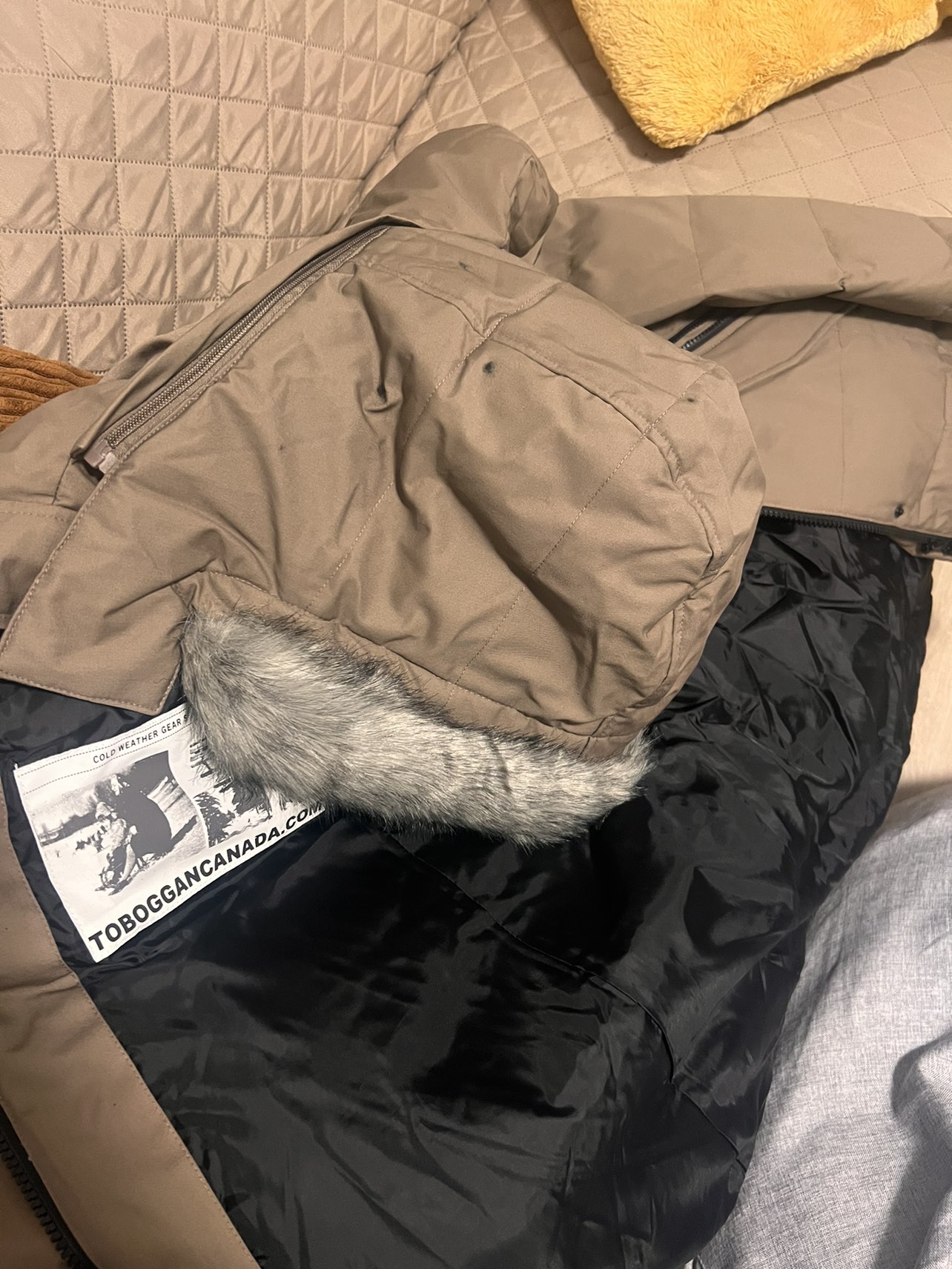 Toboggan brand , tan, knee length, up to -30c, lined with down/feathers, 2 way heavy duty front zipper, detachable hood, bought $250 (tax incl)