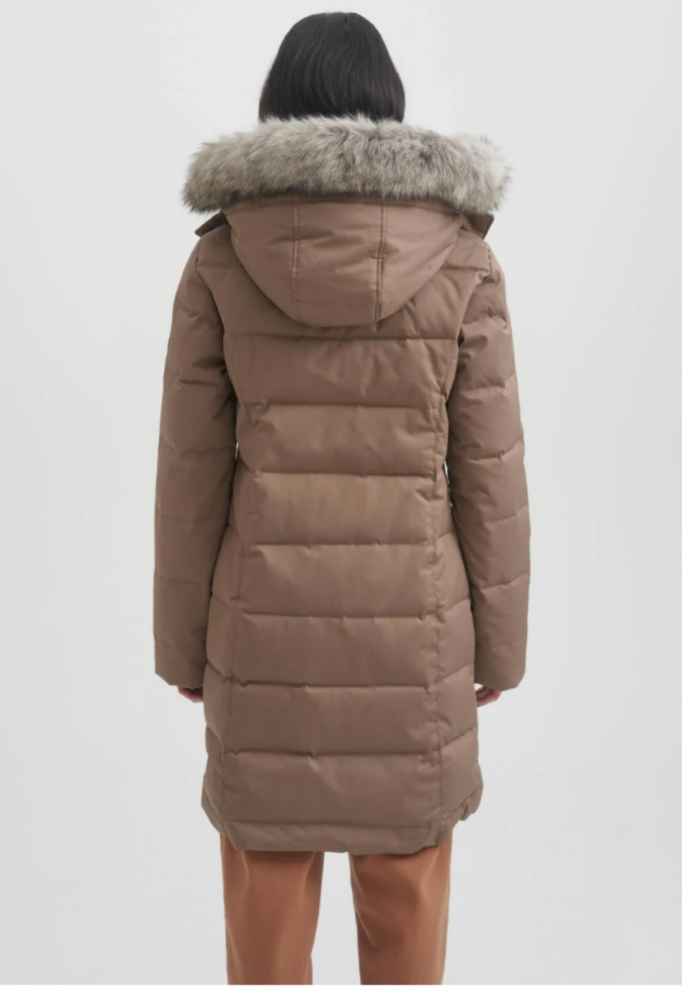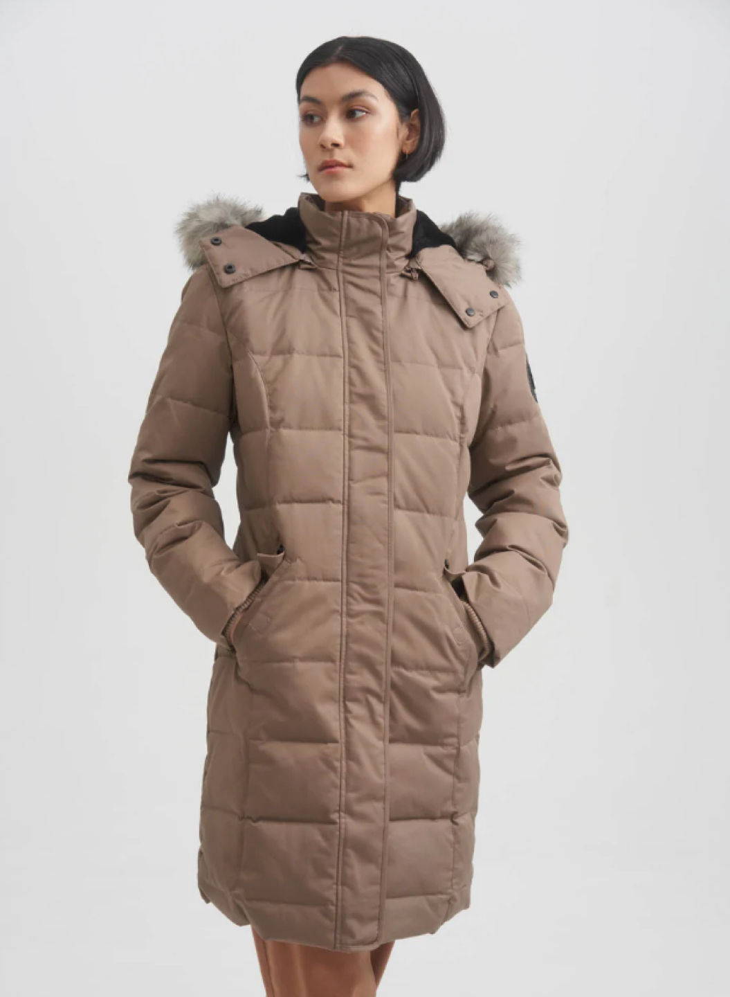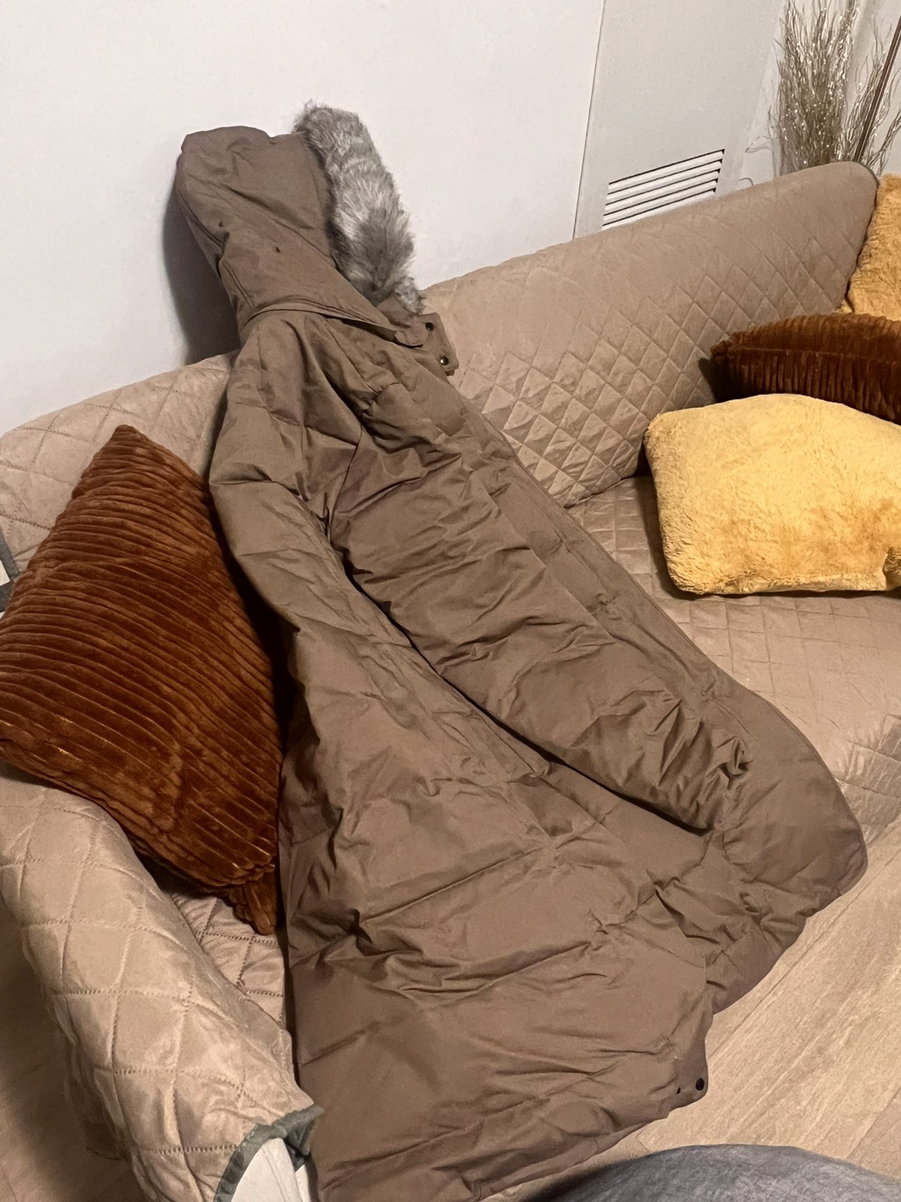 Toboggan brand , tan, knee length, up to -30c, lined with down/feathers, 2 way heavy duty front zipper, detachable hood, bought $250 (tax incl)
