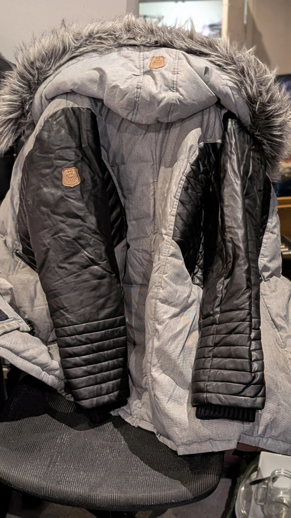 Women's hooded puffer jacket. Grey outer shell. Faux leather sleeves. Faux fur trim on the hood. In excellent condition, maybe used 5 times over 5 years. Regular price was $400. Please arrange for self pick-up. I am willing to meet somewhere or part way depending on the area/time/day. DM for further inquiries and details.