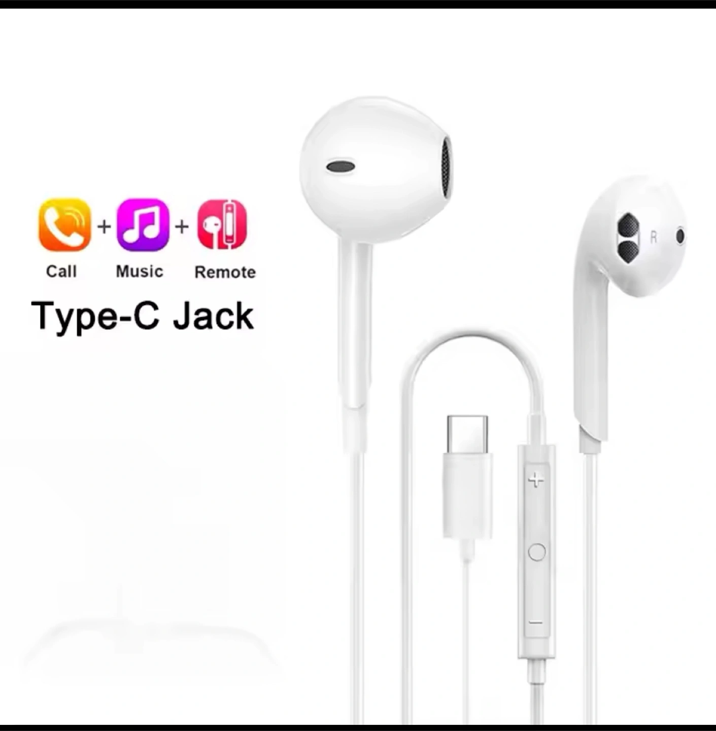 White wired earbuds. Features include call, music, and remote functions. Type-C connector.