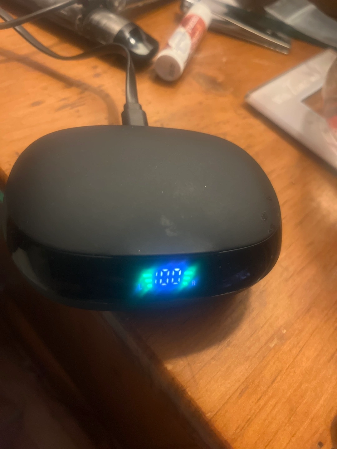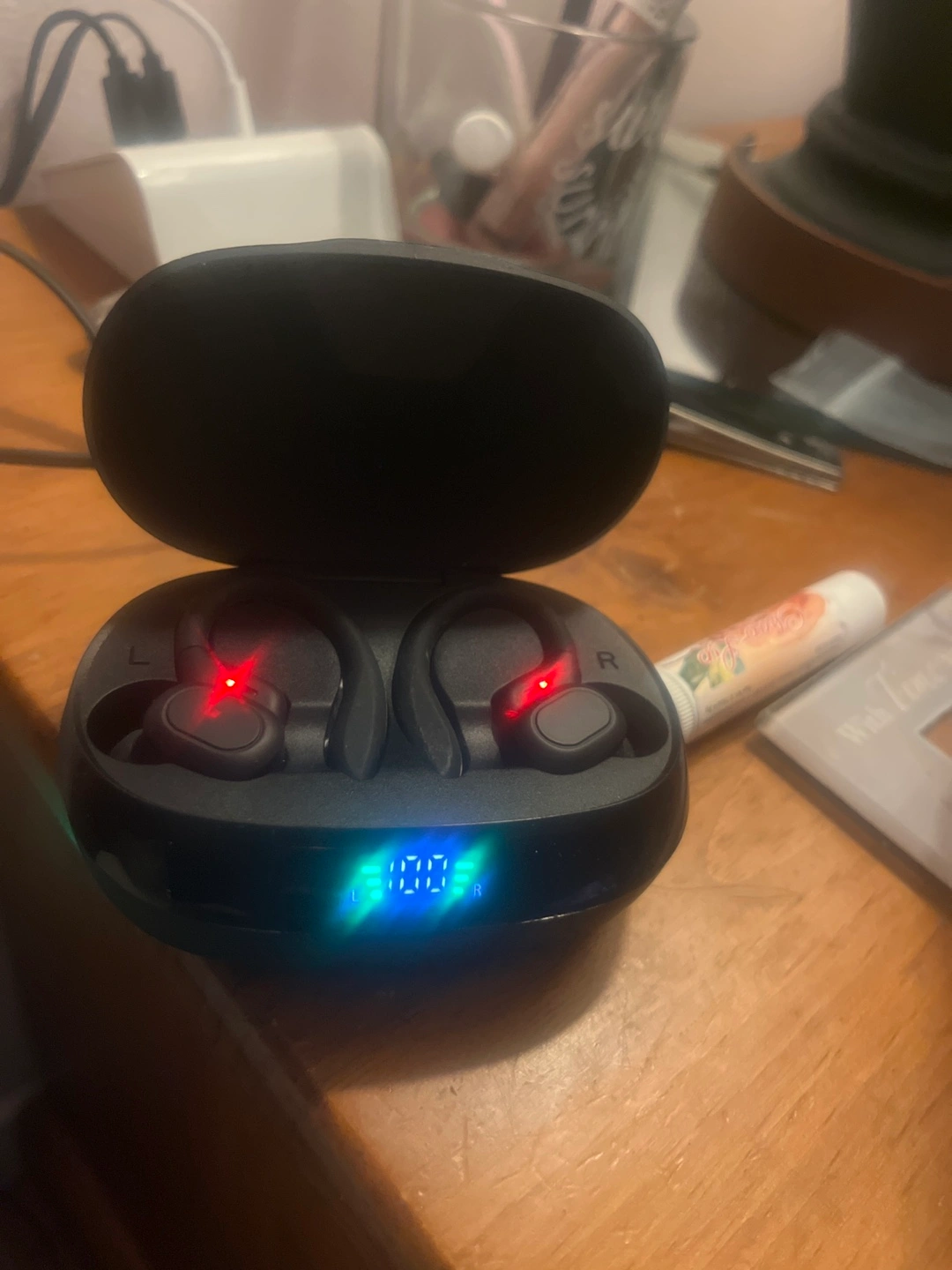 Black wireless earbuds, in-ear design. Charging case included, digital battery indicator. Answer calls. Great for workouts and everyday use.