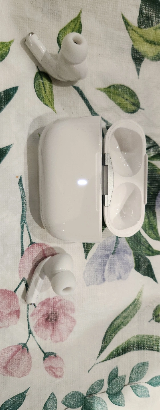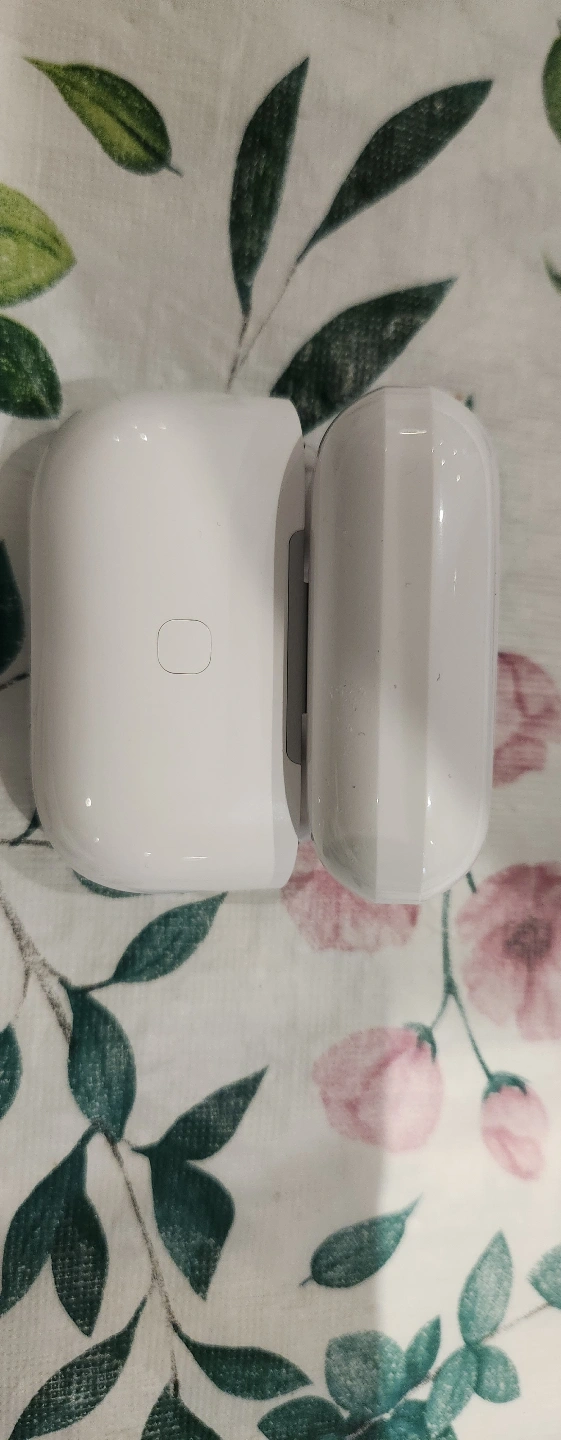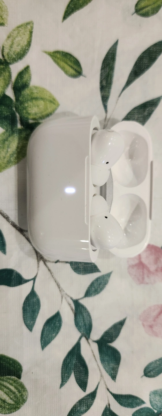 White wireless earbuds and charging case. Excellent for listening to music or podcasts. Includes two earbuds and charging case. just bought them today!
