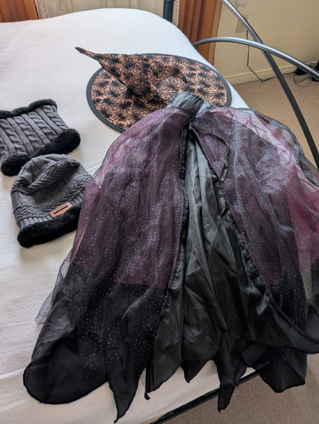 Selling a complete witch costume set! Includes a witch hat with a spiderweb design, a black and purple light up Cape with glitter details, a grey beanie, and a matching neck warmer. Perfect for Halloween or dress-up!