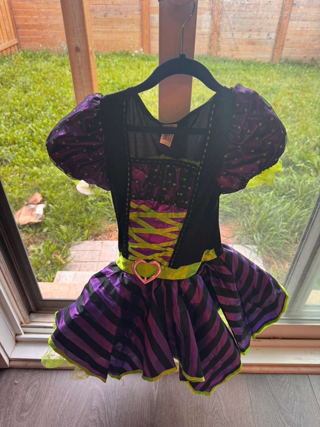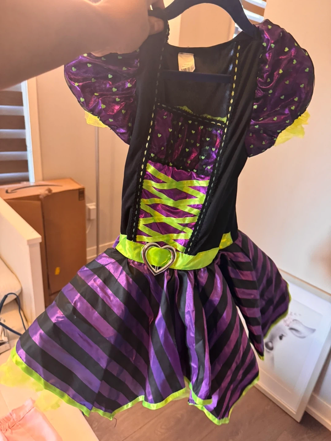 Get ready for Halloween with this adorable witch costume! It features a fun purple and black striped skirt, a black bodice with purple accents, and cute green and yellow details. Perfect for your little one's spooky adventures!