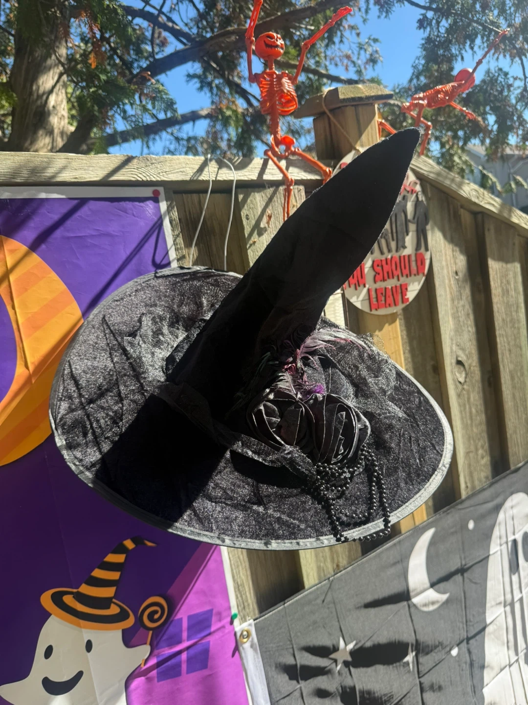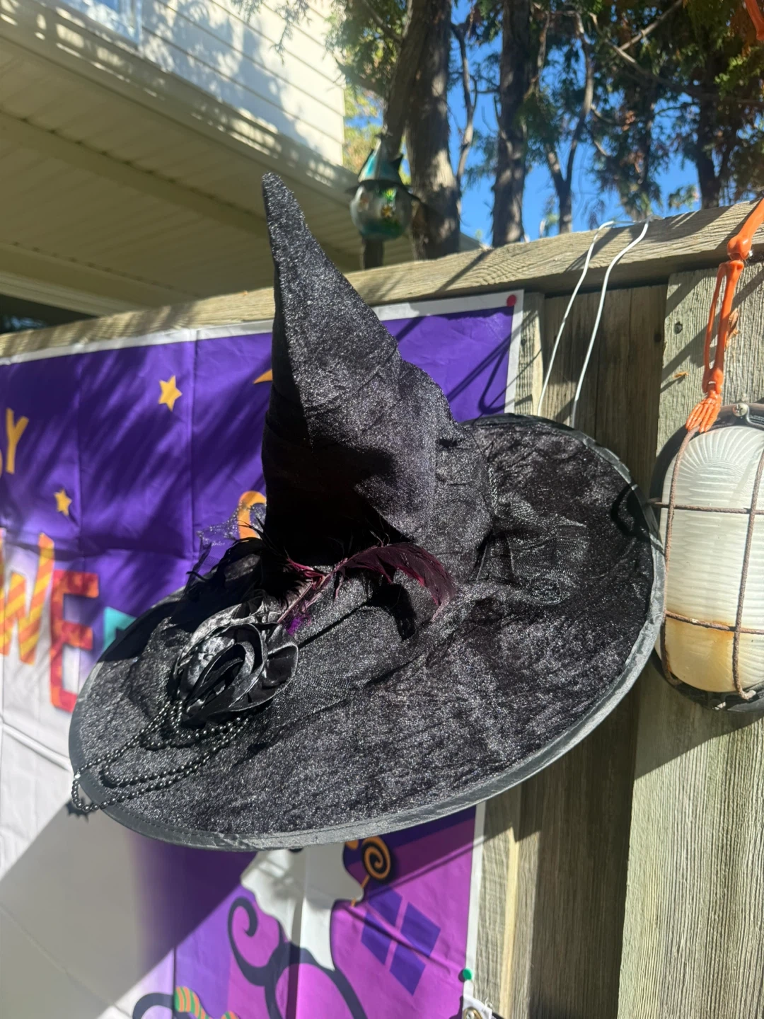 Get ready for Halloween with this classic witch hat! It's perfect for completing your costume and adding a spooky touch. The hat features a traditional pointed shape and is adorned with decorative accents. Great for parties, trick-or-treating, or any Halloween event