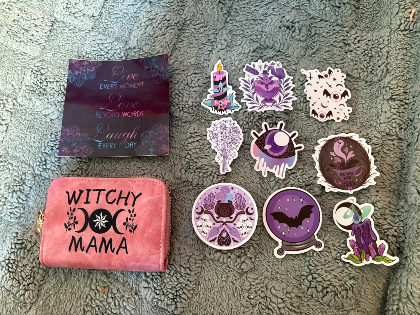 Cute pink card holder wallet with a "Witchy Mama" design on the front! It has multiple card slots inside, perfect for keeping your cards organized. It's in great condition and ready for a new home Pick up in Vanier