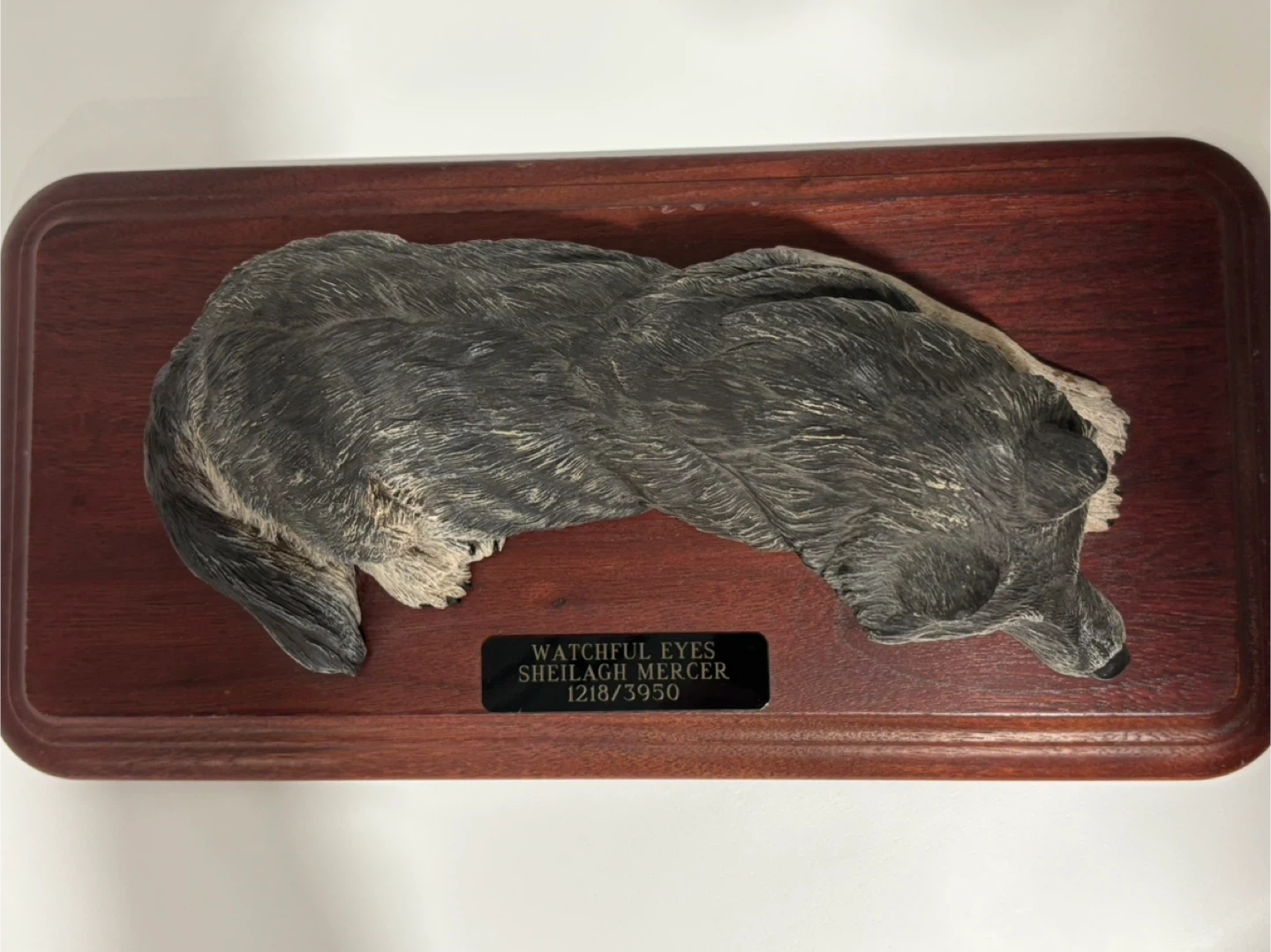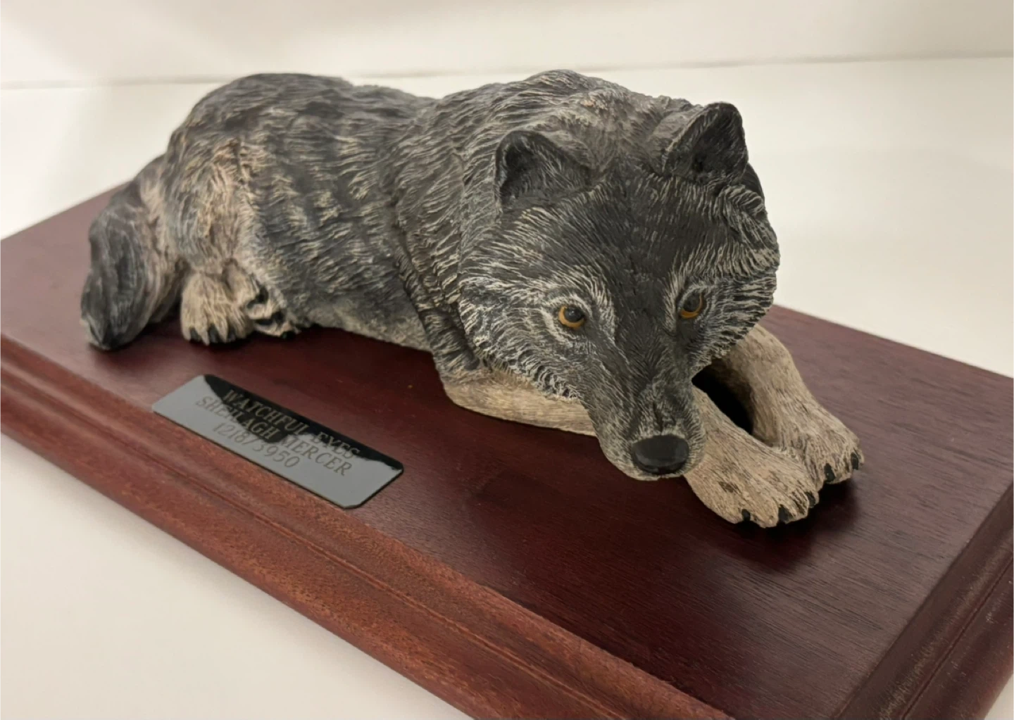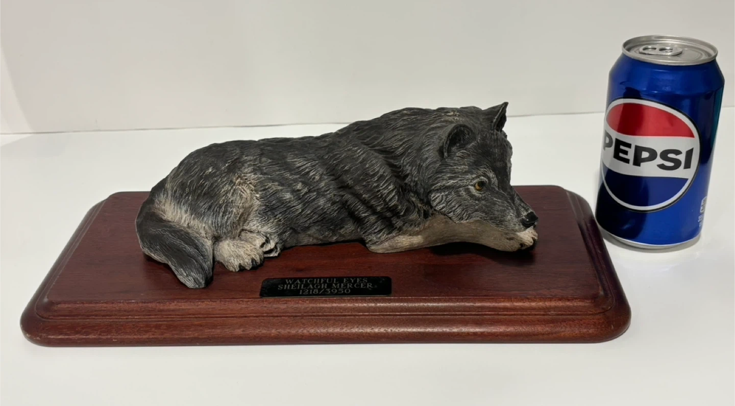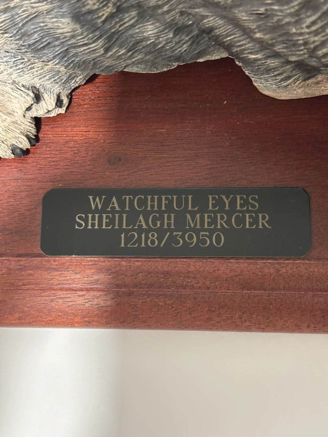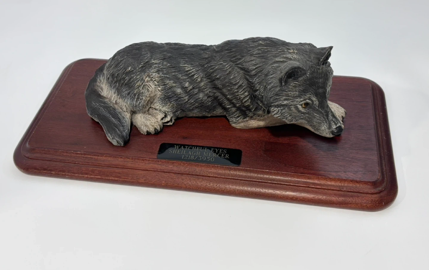 Selling a lovely wooden Vintage Sheilagh Mercer figurine titled "Watchful Eyes" It's number 1218 out of 3950 made Vintage Grey Wolf Wild Animal Limited Edition Sculpture" WATCHFULL EYES" it was designed by Canadian Artist Sheilagh Mercer .This sculpture was hand painted and numbered . It is from a wood carving created by Artist Sheilagh Margaret Mercer . It was distributed world wide by Appletree .