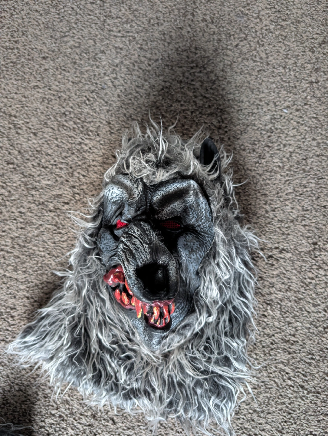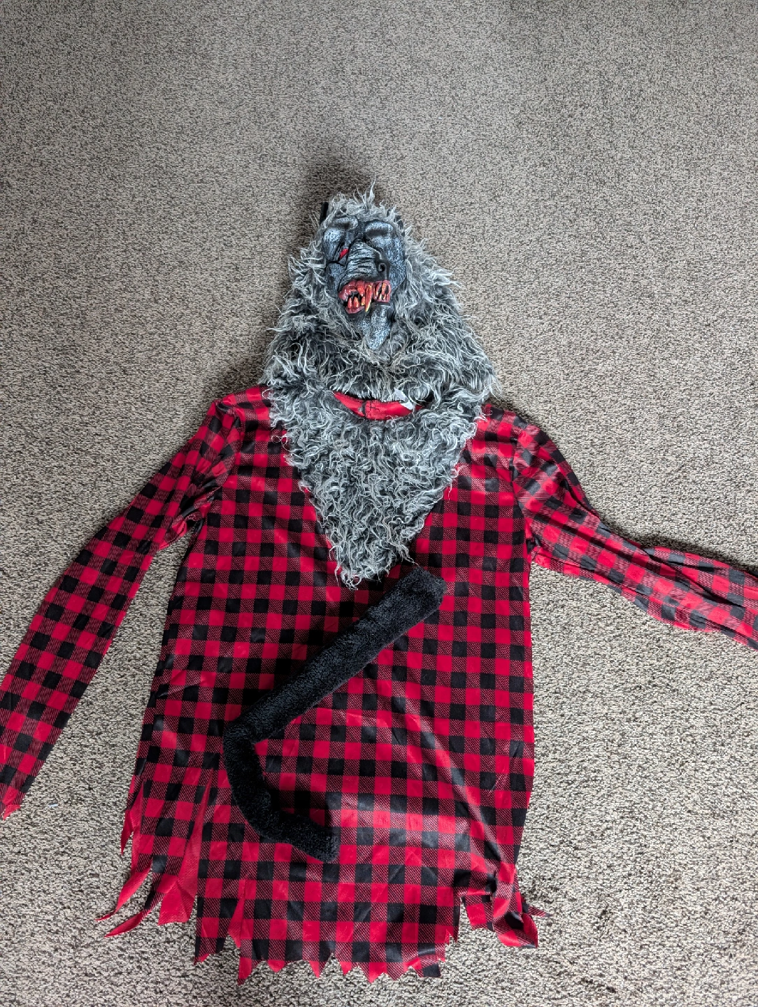 Howl-o-ween is coming up! Get ready with this wolf costume. It includes a mask and a flannel shirt with a tail attached. Perfect for a spooky night out! Youth Med or a small large fit.