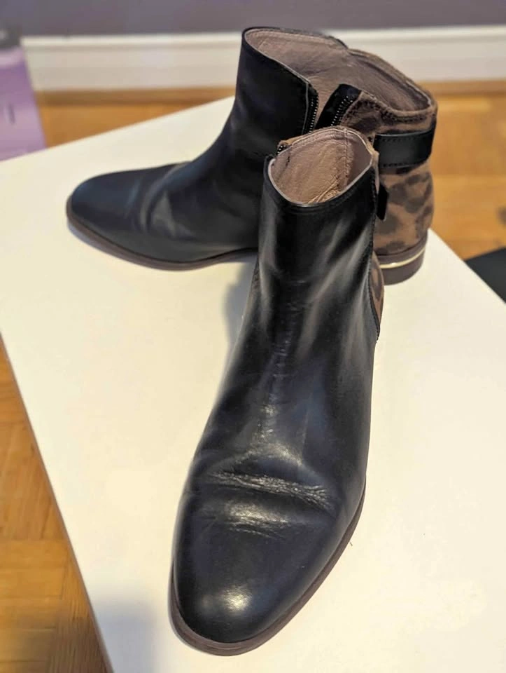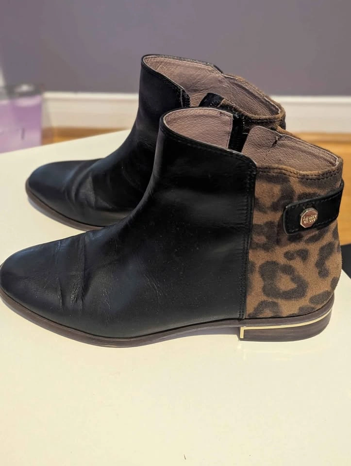 Stylish and unique ankle boots featuring smooth black leather at the front and a chic leopard print suede detail at the back. Gold-tone hardware accent at the heel and back strap adds a touch of elegance. Size: 7 Condition: gently worn, excellent overall shape Side zipper for easy wear Comfortable low heel, perfect for all-day use Pairs great with jeans, skirts, or dresses 💲 $60 📍 Pickup in Vaughan ✨ Give your outfit a pop of personality with these statement boots!