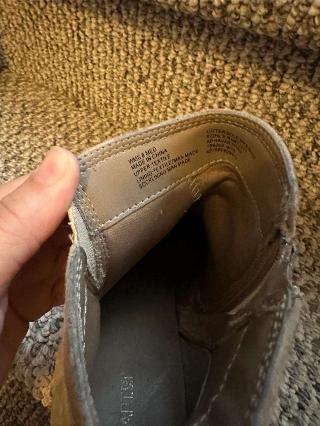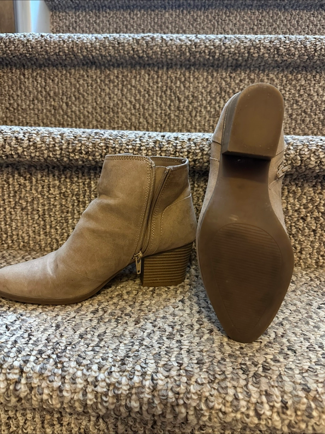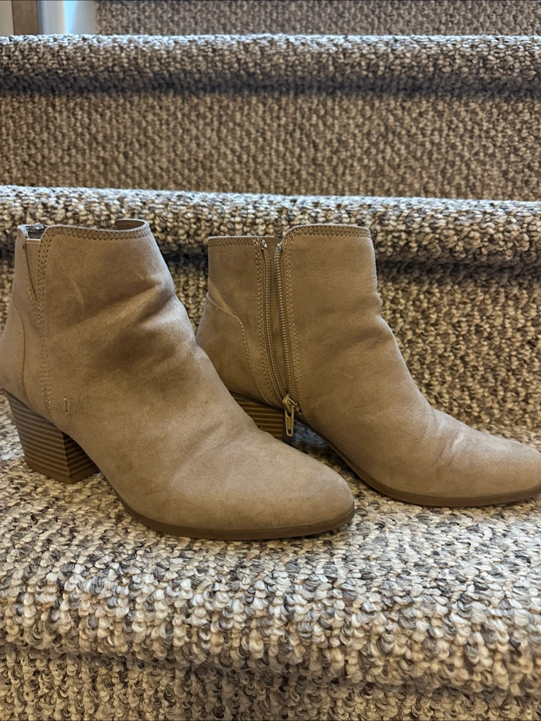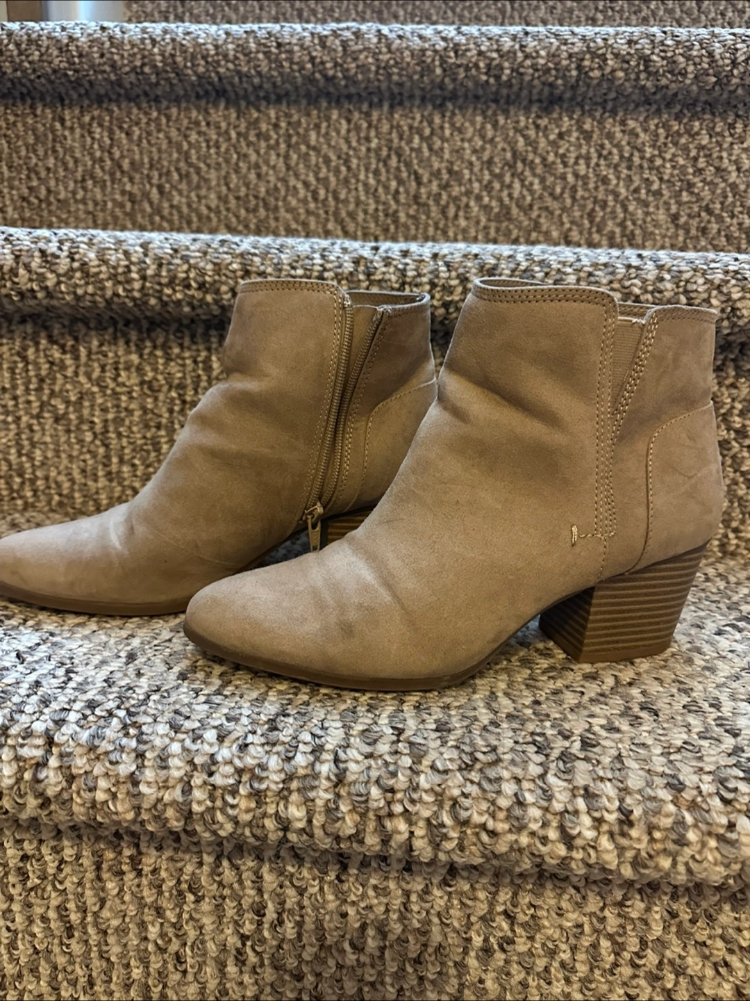 Here are some Apt. 9 ankle boots in a neutral colour. They are a women's size 8. The material is textile and man-made. They have a small heel and a zipper on the side