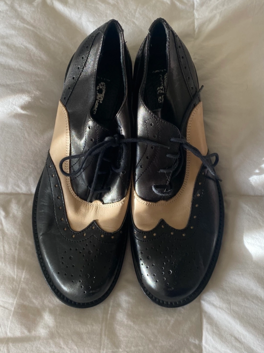 Pair of timeless women’s wingtip oxfords. Black and beige leather. Lace-up closure. Wingtip design. Perforated detailing. All leather. Italian made.